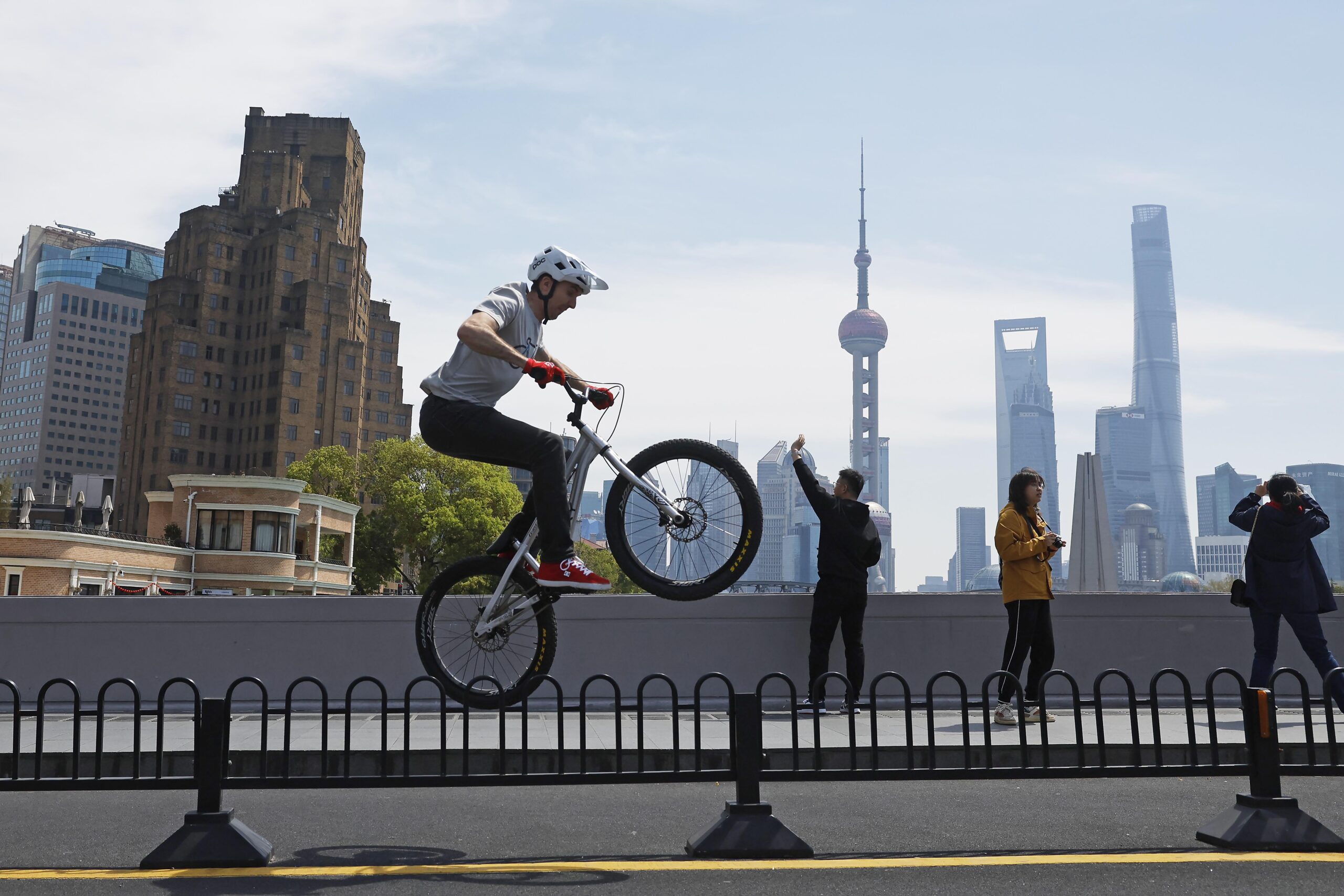 4月5日,清明假期,游人在上海市苏州河上的四川里桥上进行自由式小轮车表演。