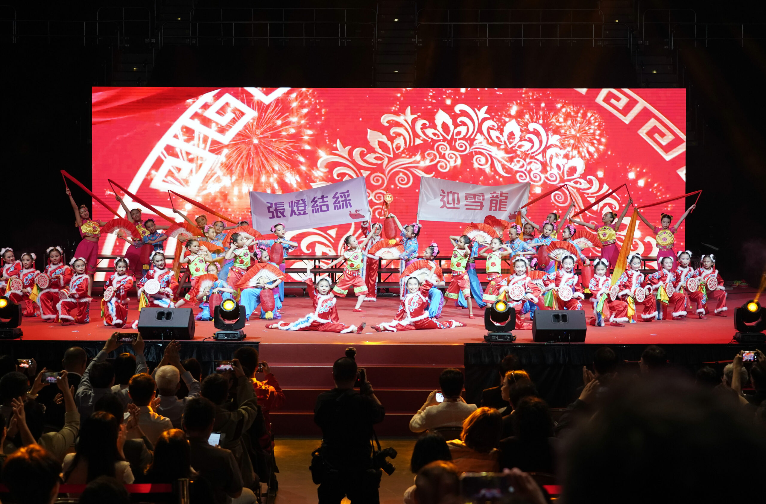 4月8日晚,为欢迎中国首艘自主建造的极地科考破冰船“雪龙2”号和中国第40次南极考察队访问香港,一场丰富多彩的文艺晚会在香港伊利沙伯体育馆举行。香港青少年为“雪龙2”号船员和科考队员表演精彩的节目,科考队员和船员则向现场观众讲述南极考察、“秦岭站”建站故事,并展示了难得一见的科考装备服装秀。图为少年儿童表演舞蹈《张灯结彩迎雪龙》。