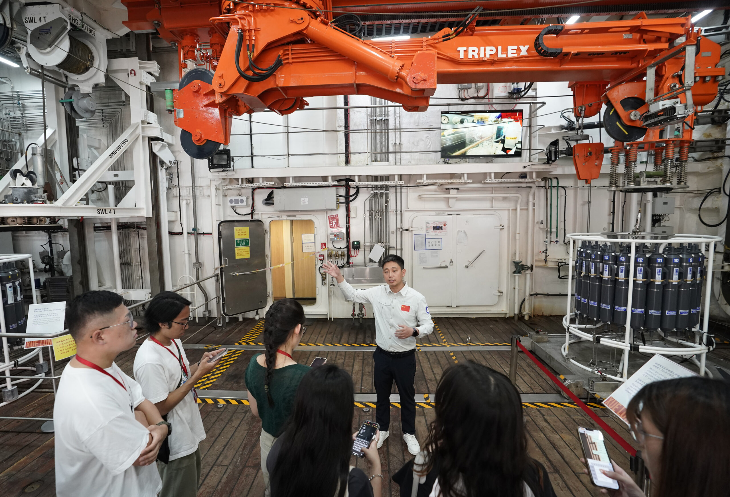 4月8日下午,当天抵达香港进行首次访问的中国第一艘自主建造的极地科考破冰船“雪龙2”号向媒体和公众开放参观。据悉,当天起至12日“雪龙2”号停泊期间,将向约3000名香港公众免费开放参观船上部分区域,并由船员和中国第40次南极考察队队员向参观者介绍船上部分设施设备和科考内容。图为南极考察队队员向媒体介绍科考区域的设施设备。