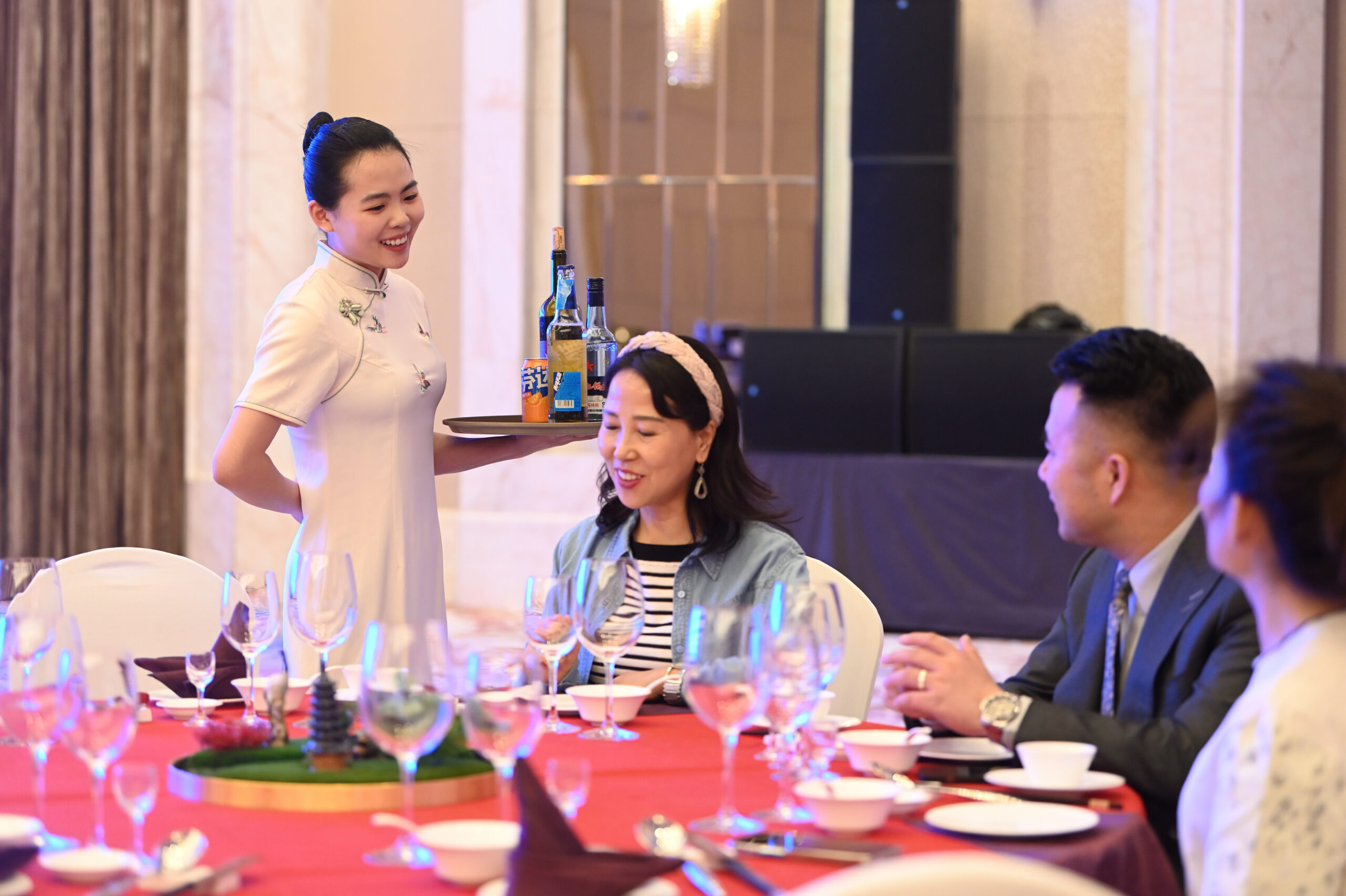 4月9日,内蒙古呼和浩特市,内蒙古商贸职业学院酒店管理专业大二学生王飞扬(左一)参加中餐服务比赛,她说:“我的服务让客人开心,自己也会开心起来。”当日,呼和浩特市旅游饭店服务技能大赛院校组比赛开赛。此次大赛中,来自内蒙古多所职业院校的大学生共同参赛,在客房服务、前厅服务、西餐服务和中餐服务4个项目中角逐。