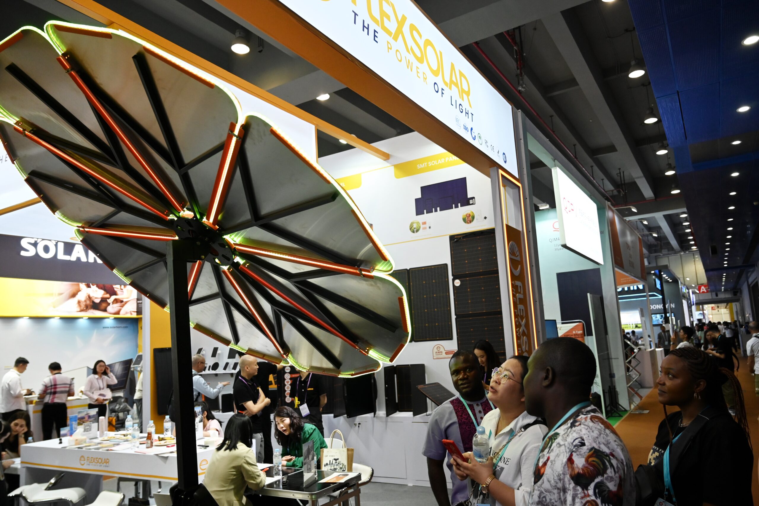 4月15日,广东广州,新能源展区一展位的“太阳能树”吸引采购商。当日,第135届中国进出口商品交易会(广交会)开幕。 未经允许不得转载:城市新闻网icitynews » 第135届广交会新能源展区人气旺