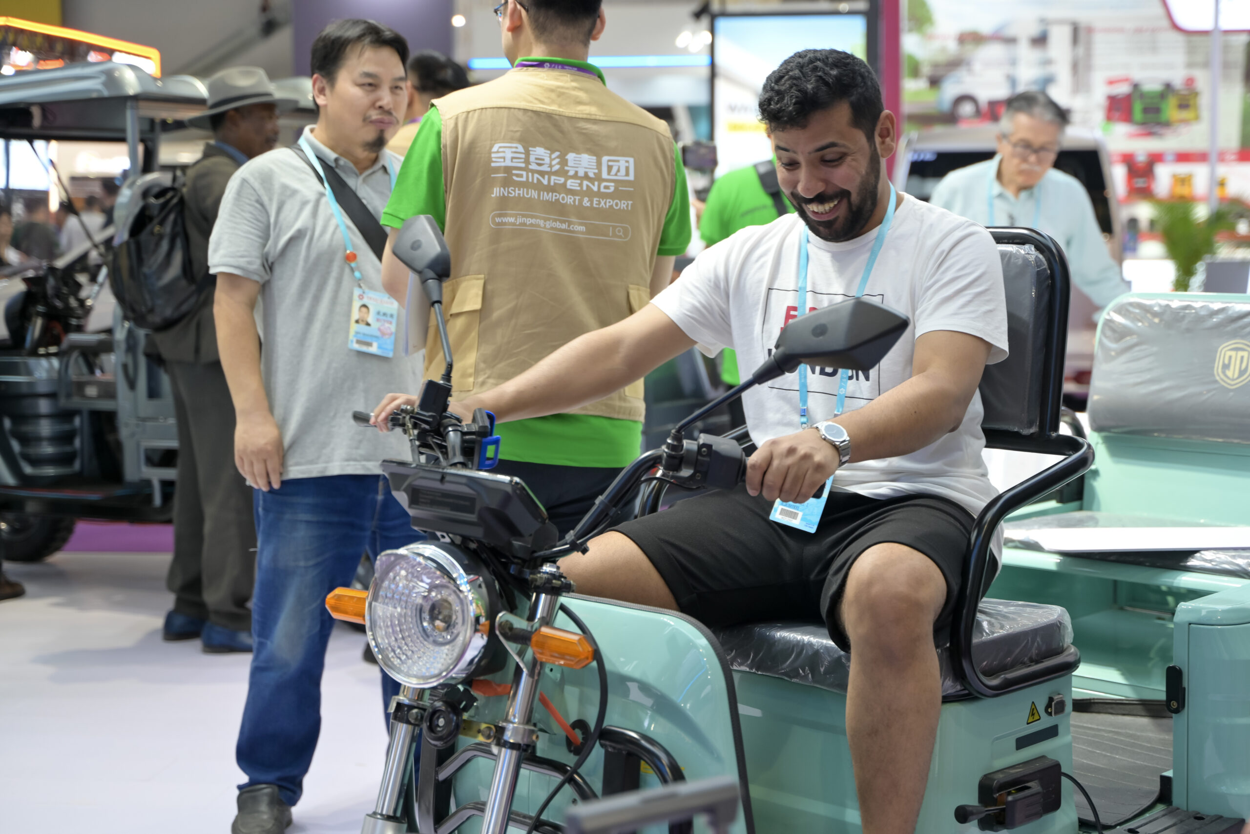 4月15日,第135届中国进出口商品交易会(广交会)在广州开幕。据广交会组委会统计,截至4月15日17时,第135届广交会首日境外采购商线下到会超6万人,来自全球205个国家和地区,到会人数比上届同期增长18.5%。图为采购商体验一款电动三轮车。