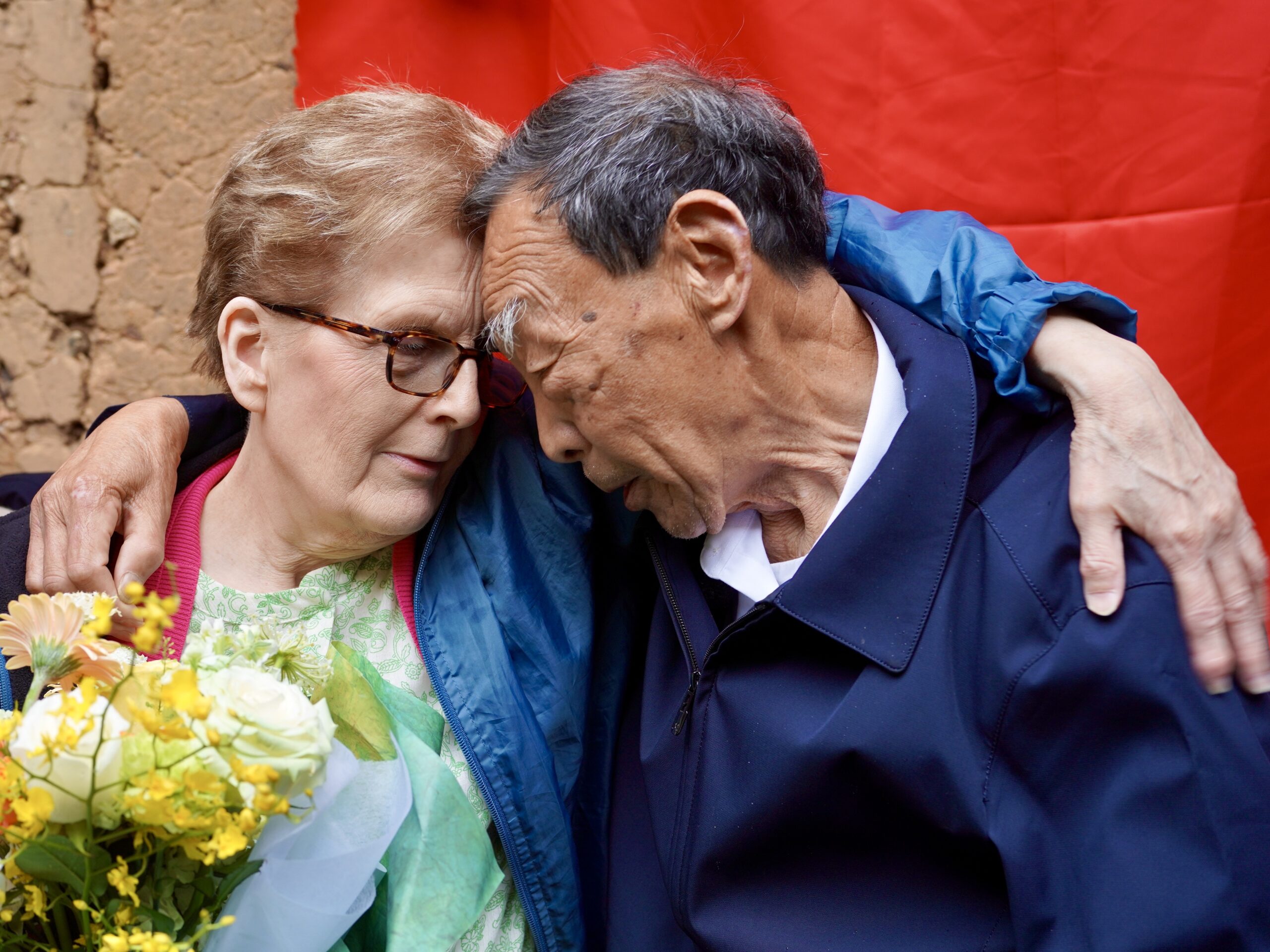 4月17日,在浙江衢州江山市廖家老宅,美国飞行员查尔斯·奥祖克的女儿苏珊·奥祖克(左)与营救其父的江山市村民廖诗元之子廖明发头贴头、肩搭肩。“让血与火铸造的友谊代代相传——纪念杜立特行动大救援82周年”中美民间文化交流系列活动此间在浙江衢州举行。二战期间,日军偷袭珍珠港后,美国决定空袭日本本土。1942年4月18日,美军派出“杜立特突袭者”轰炸日本东京等五个城市。返航时,机组成员因燃油耗尽等原因弃机跳伞或迫降,中国军民随后展开营救,成就中美友谊佳话。