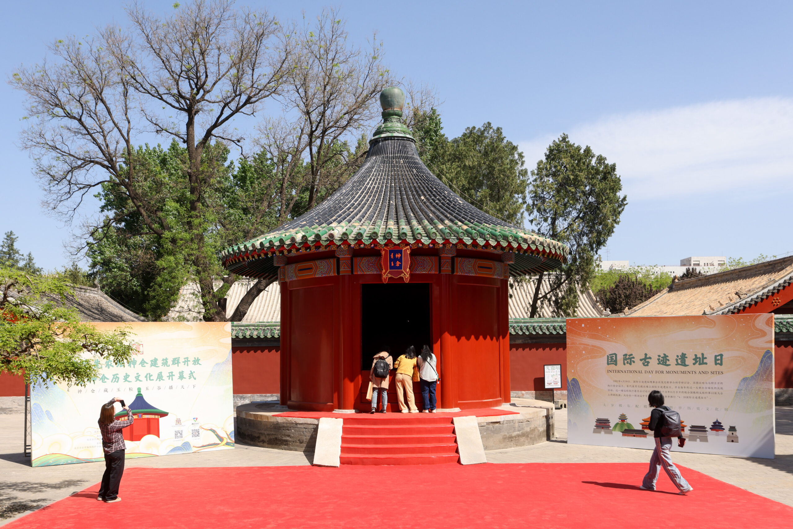 4月18日,是第42个“国际古迹遗址日”,“北京先农坛神仓建筑群开放暨神仓历史文化展开幕式”活动在北京古代建筑博物馆(先农坛)神仓院落开幕,这也是神仓建筑群移建200多年来首次面向公众开放。神仓建筑群是北京先农坛重要的组成部分,始建于1531年,1753年清朝乾隆皇帝下旨将神仓建筑群移建于此。神仓主要功能是用来储存皇帝亲耕耤田收获谷物,是为皇家祭祀活动提供谷物的场所,承载着礼仪功能,其中神仓圆廪被称之为“天下第一仓”,为先农坛独有。图为市民游客参观开放后的神仓建筑群。