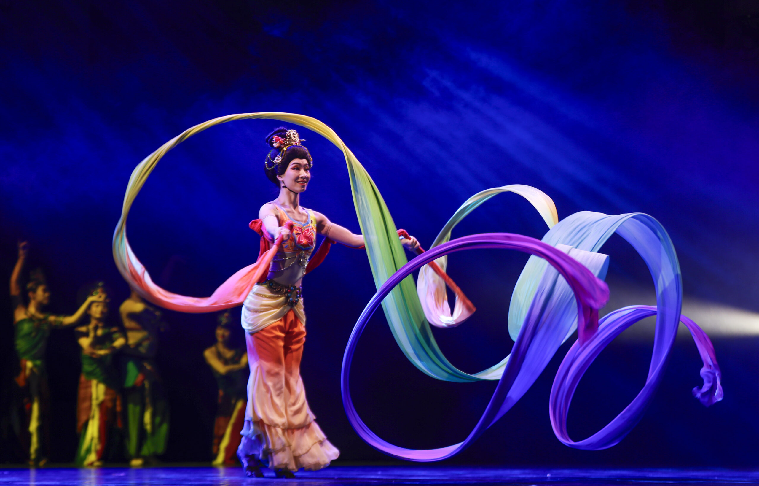 4月17日,舞蹈演员在安徽省黄山市徽州大剧院表演情景音画剧《千手千眼》。大型情景音画剧《千手千眼》是以中国残疾人艺术团音乐舞蹈诗《我的梦》为蓝本,融合世界文化遗产敦煌壁画元素创编而成。剧目依托敦煌莫高窟现存唯一以观音为主题的第3窟《千手千眼观音经变》图,通过音乐、舞蹈、多媒体等形式创新讲述“妙善救父”的民间故事。