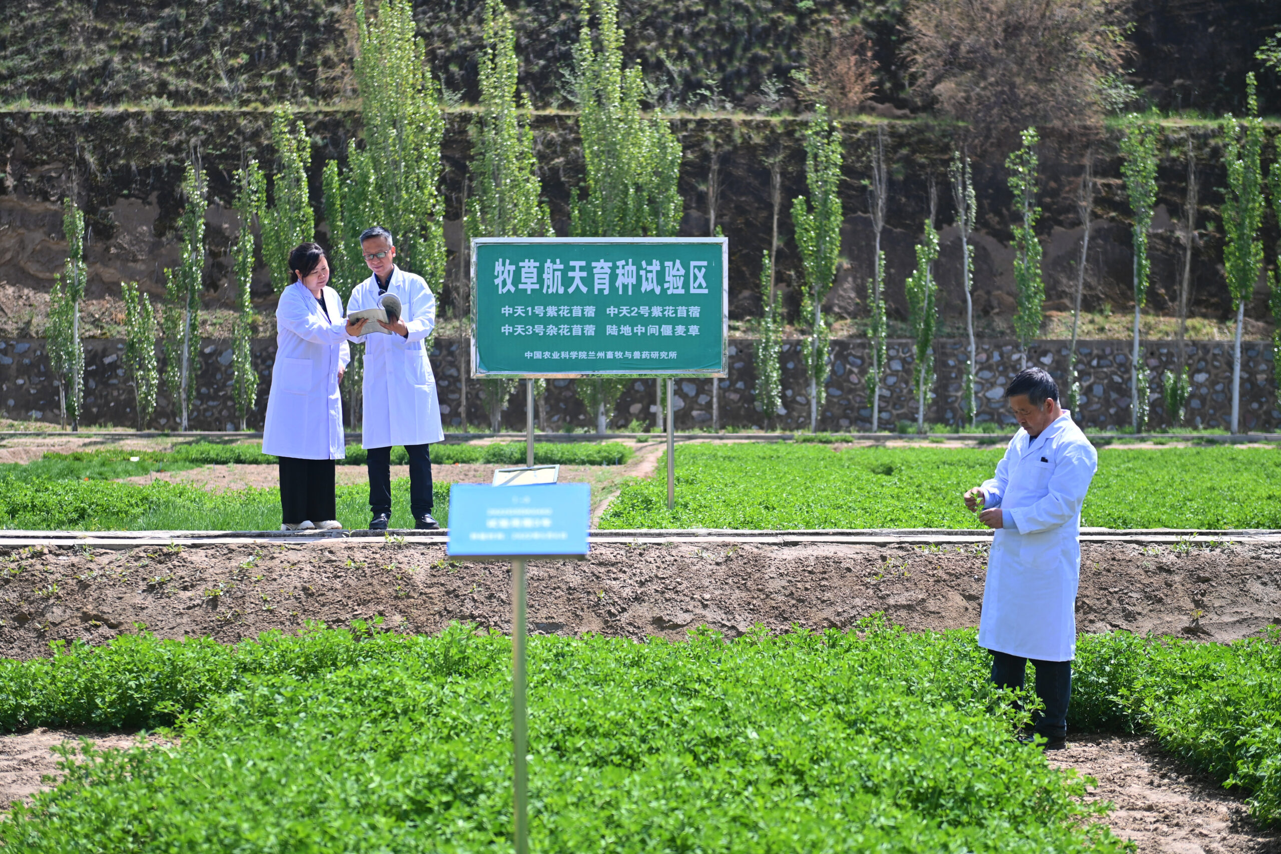 4月19日,甘肃省兰州市,中国农业科学院兰州畜牧与兽药研究所牧草航天育种试验区内,“抗逆牧草育种与利用”杨红善团队记录“中天1号、2号紫花苜蓿”试验田数据。在中国航天日来临之际,中新社记者前往中国农业科学院兰州畜牧与兽药研究所探访了牧草航天诱变育种。该团队通过航天育种,已经先后培育出“中天1号、2号紫花苜蓿”和“中天3号杂花苜蓿”三个国家新品种和“中天4号燕麦”省级新品种。兰州牧药所是航天育种产业创新联盟的发起单位和理事单位之一。
