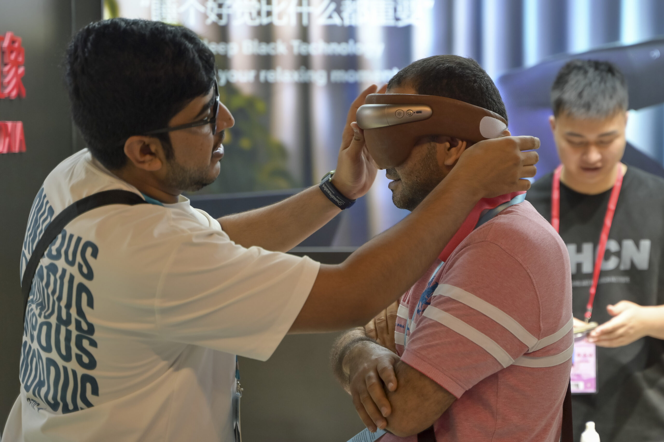 4月19日,广东广州,采购商在第135届广交会上体验一款眼部按摩仪。当日,第135届广交会第一期闭幕。第135届广交会第二期将于4月23日开幕,展览题材包括家庭用品、礼品及装饰品、建材及家具。