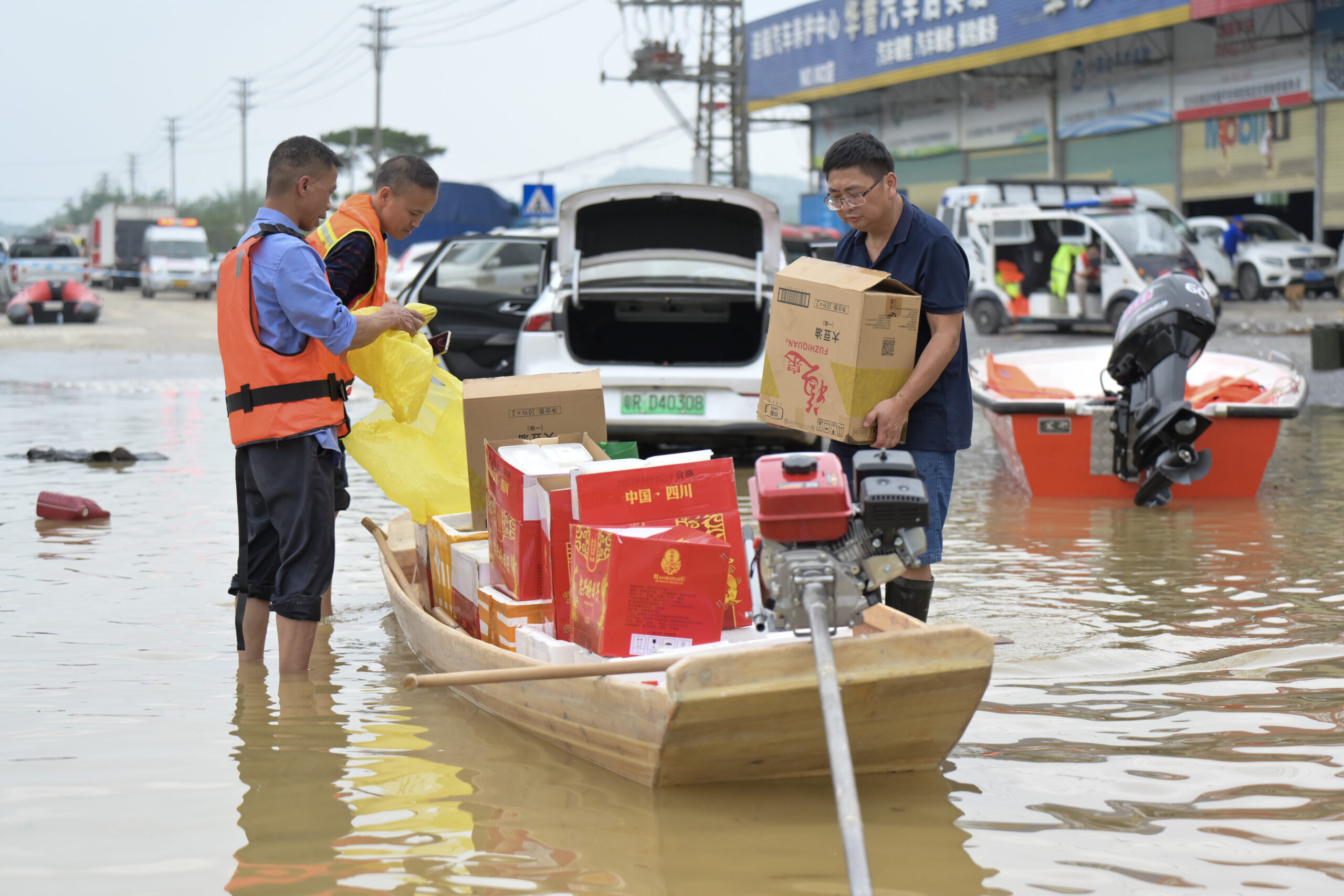 4月22日,广东省清远市英德市,救援人员搬运物资前往浛洸镇。受持续强降雨影响,广东省北部的韶关市和清远市出现洪涝灾情,广东省减灾委已启动Ⅳ级救灾应急响应。