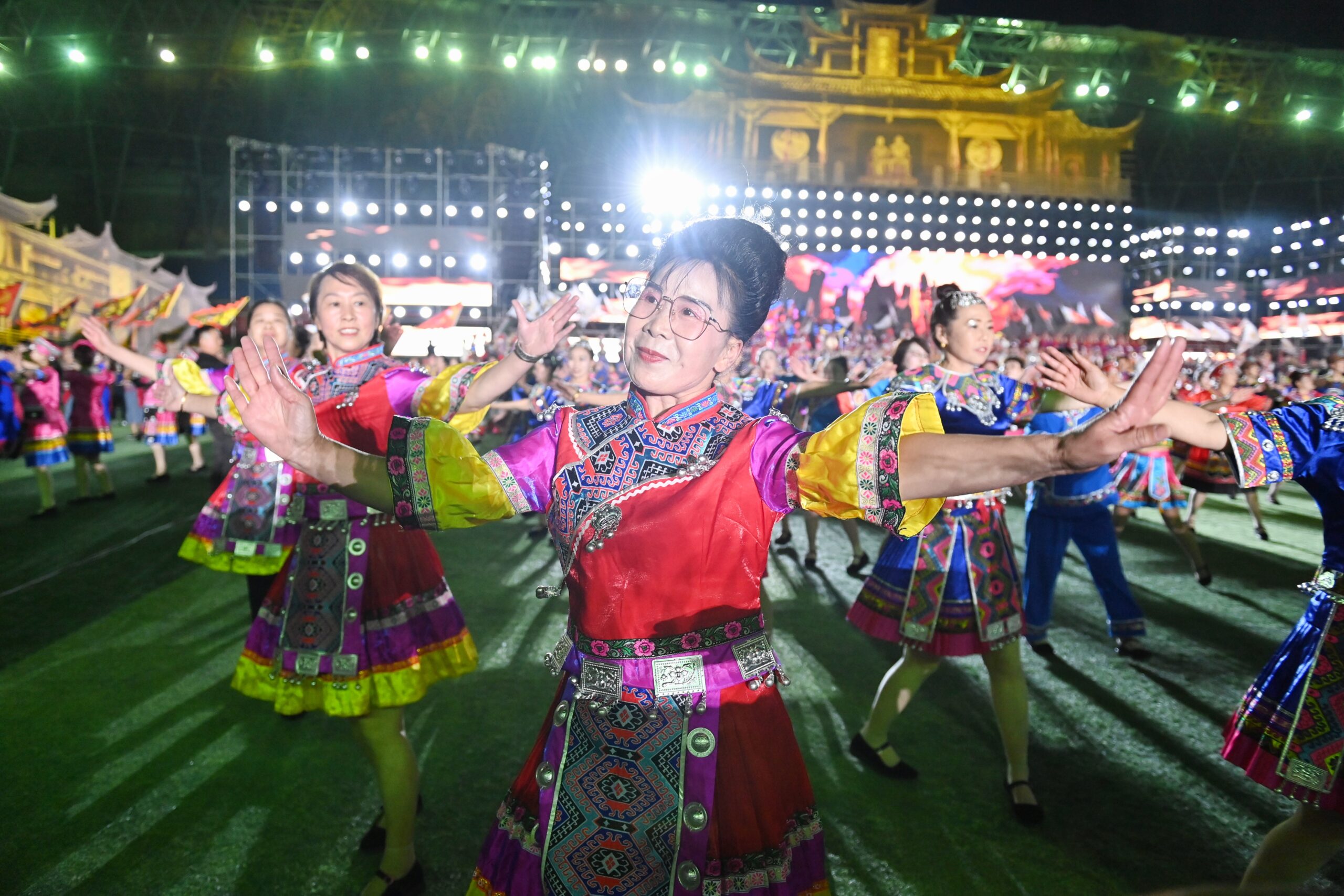 4月23日晚,第九届龙山“舍巴日”活动在湖南龙山县体育中心开幕,当地居民身着盛装与游客围绕着篝火跳起了摆手舞,欢庆节日。“舍巴日”为土家语,意为“摆手舞”。原为土家族歌舞祭祖、庆丰祈福的传统节庆,现已演变为土家族民族民间文化的综合传承载体。图为当地居民翩翩起舞。