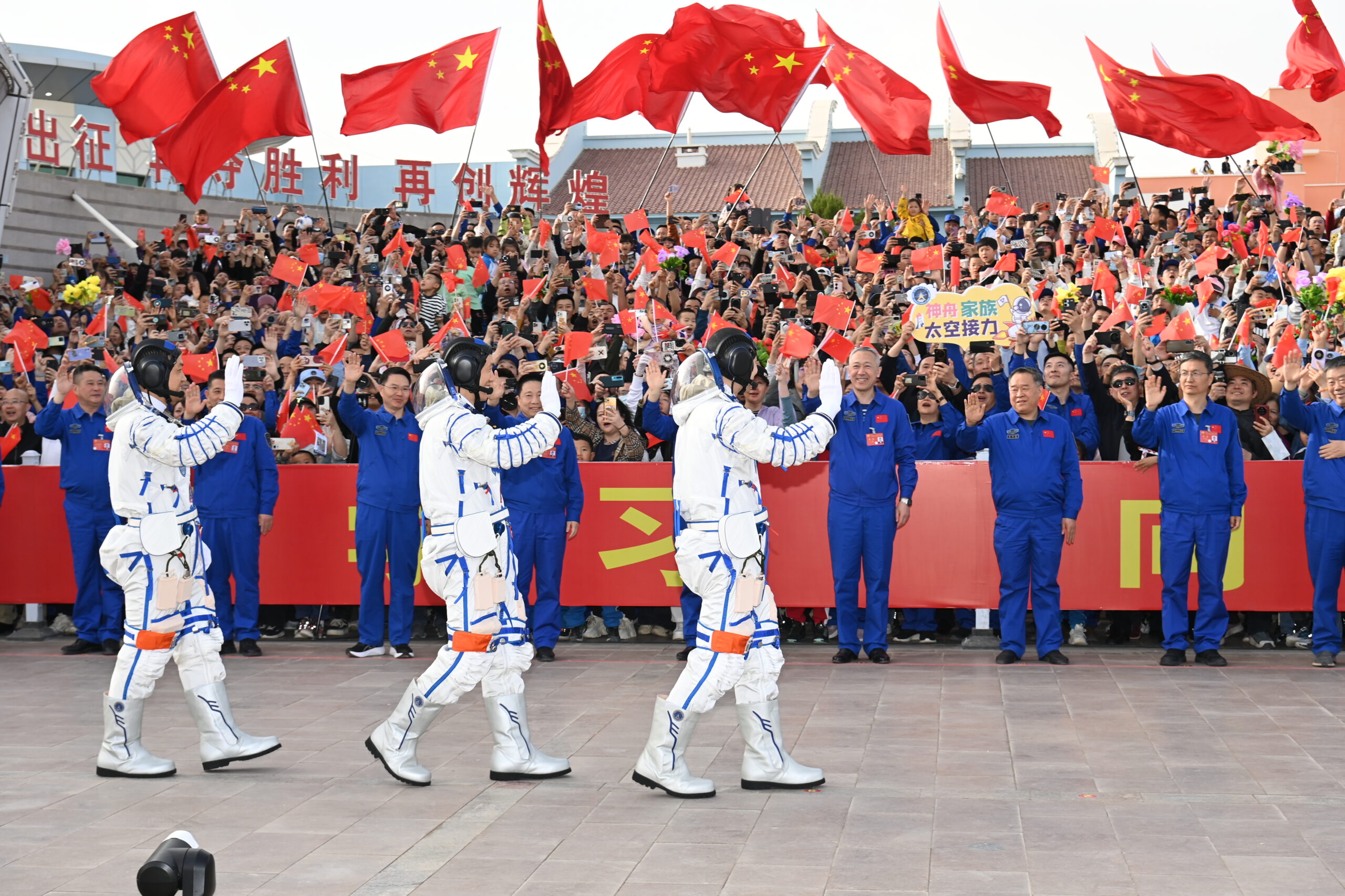 4月25日下午,神舟十八号载人飞行任务航天员乘组出征仪式在酒泉卫星发射中心问天阁圆梦园广场举行。