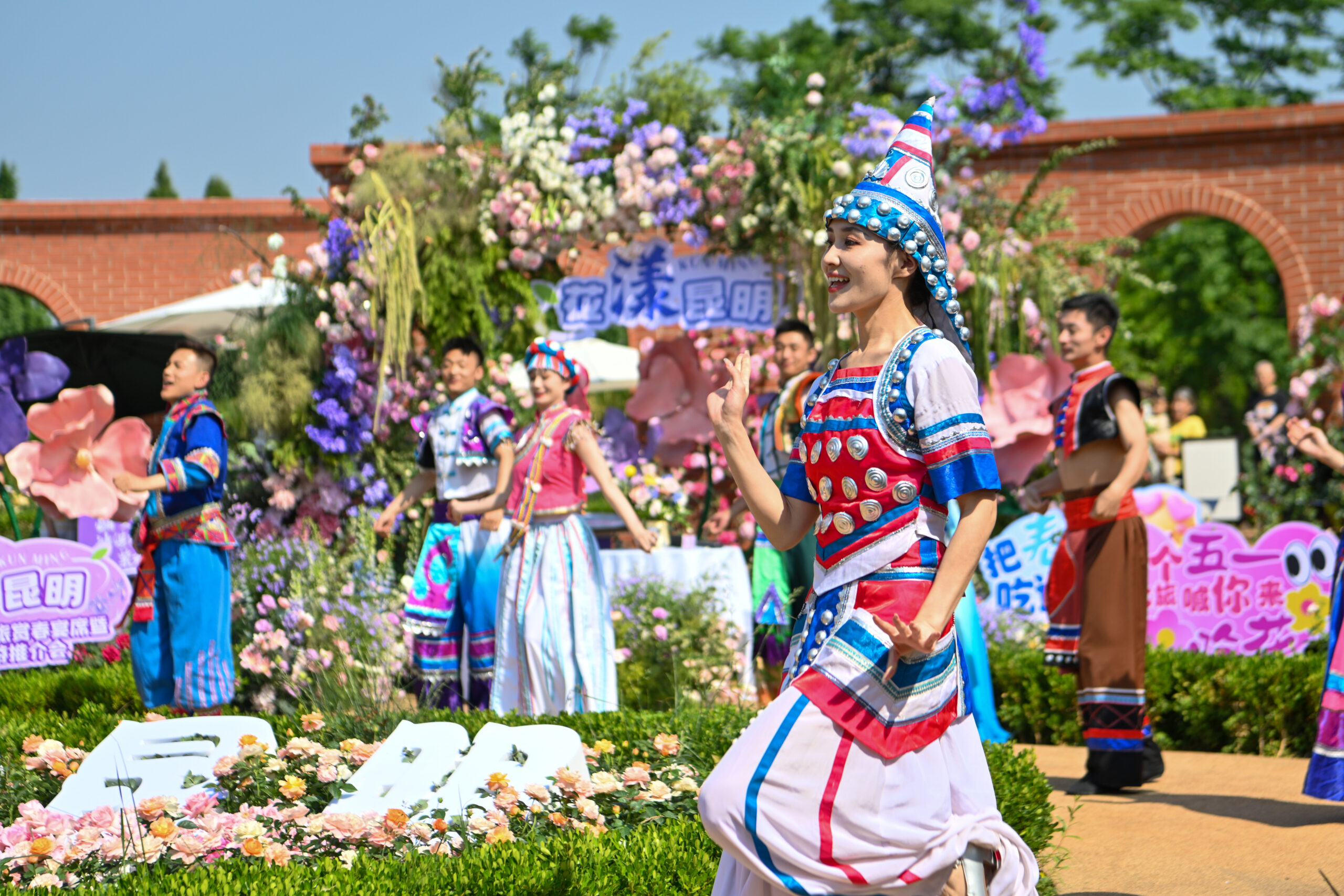 4月26日,工作人员打跳推介昆明。当日,“花‘漾’昆明”2024昆明文旅赏春宴暨五一旅游推介会在云南省昆明市举行。推介会上,昆明市文化和旅游局为游客推出“五一昆明赏花地图”。