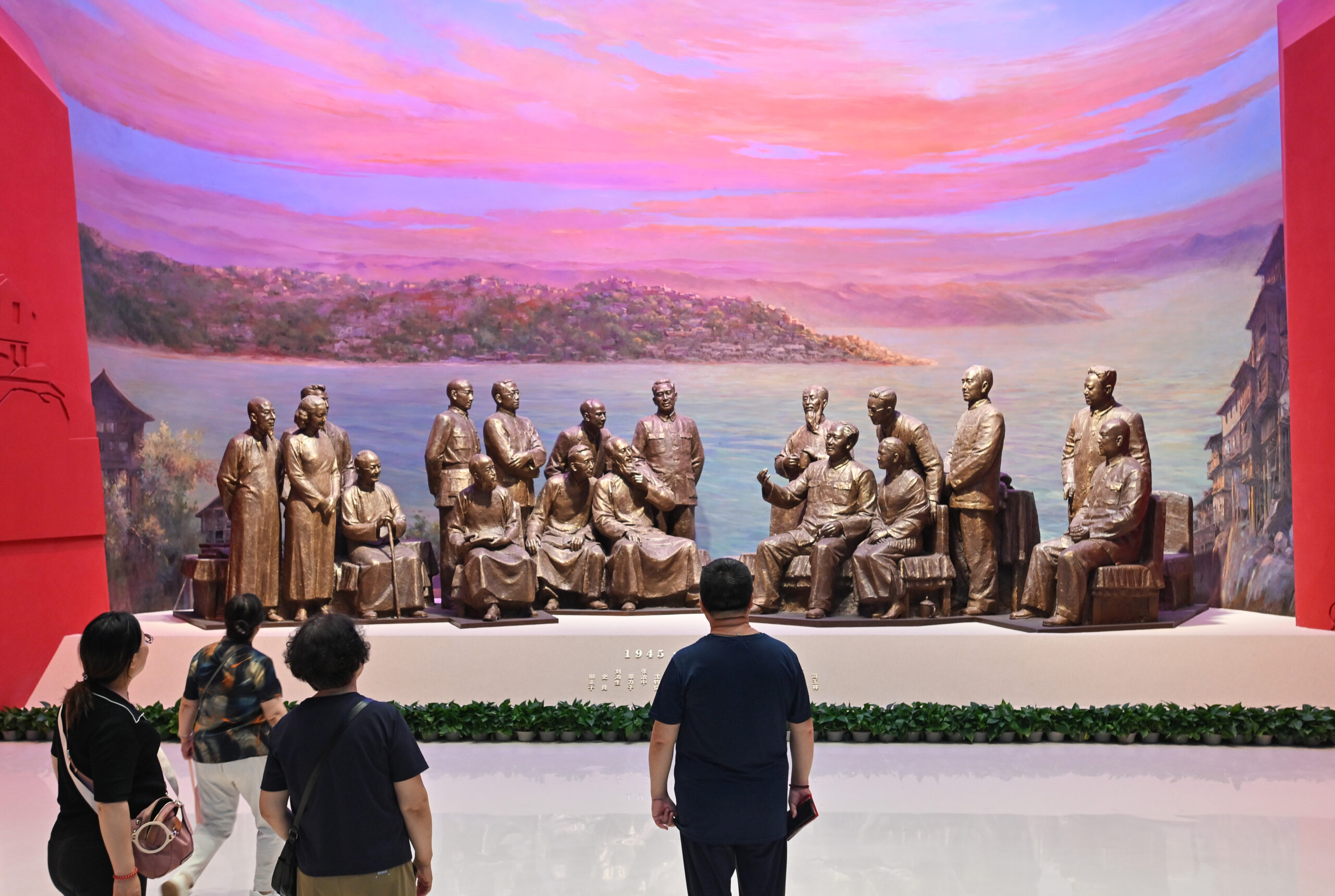 4月29日,中国民主党派历史陈列馆经过扩容升级之后,正式向公众开放。该馆位于重庆市渝中区,依托民盟元老鲜英的公馆特园建立,2021年11月闭馆改陈布展。全新开放的陈列馆建筑面积近2万平方米,包括中国新型政党制度和八个民主党派、无党派人士等展厅,以图文和文物实物叙事,声光电多手段呈现,展出历史图片1300余幅、文物实物2200余件(套)。图为市民观看陈列馆内的大型群雕《1945·毛泽东在重庆》。