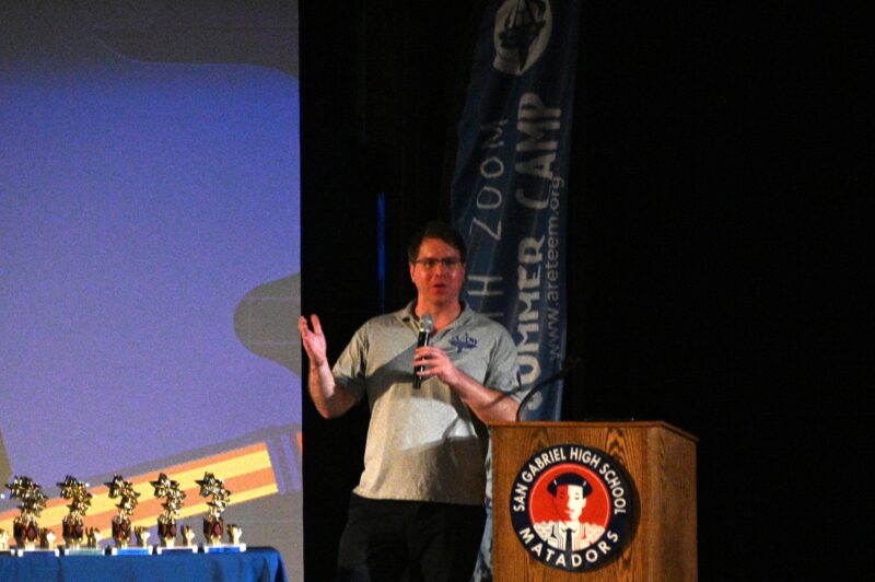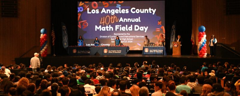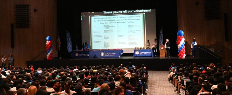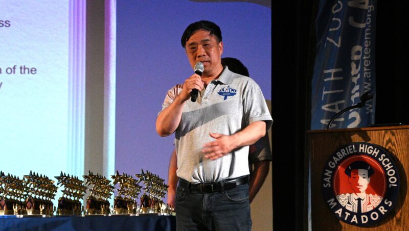 城市新闻4月27日圣盖博报导,「绿影覆幽池,芳菲四月时」。一年一度的洛杉矶数学大赛LA Math Field Day在圣盖博中学圆满落幕。主办方美国爱睿星教育集团负责人王锋博士与伦斯密老师和洛杉矶县教育署负责人亚特威尔同台发奖,并祝贺所有参赛的学生。现场的官员、学生、家长和老师超过一千多人,整个大礼堂座无虚席,连走道上也站满了人。