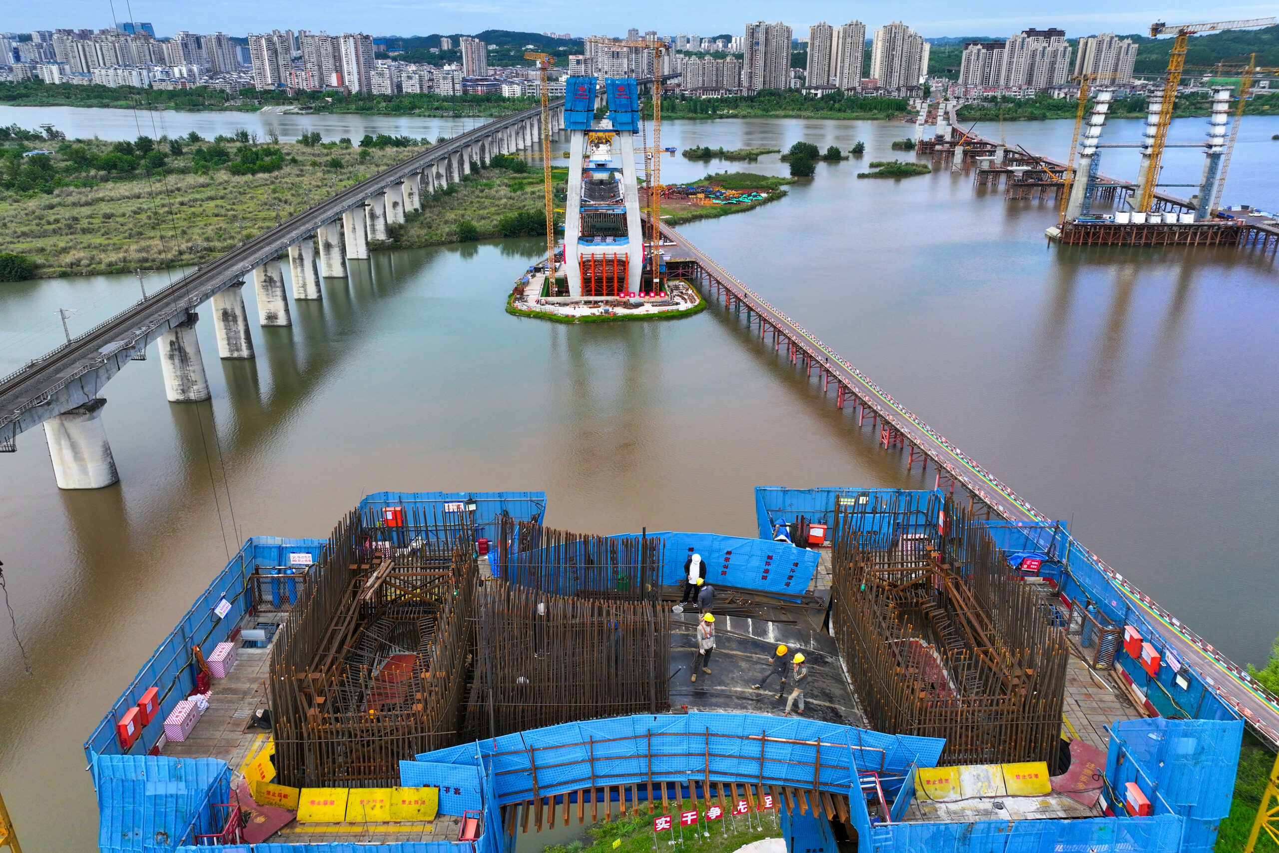 4月30日,四川遂宁,工人师傅们正在成达万高铁遂宁涪江特大桥主塔上施工作业。当日,四川成都经达州至重庆万州高铁(简称“成达万高铁”)遂宁涪江特大桥建设工地主塔和架梁建设工作有序推进,现场一派繁忙景象。
