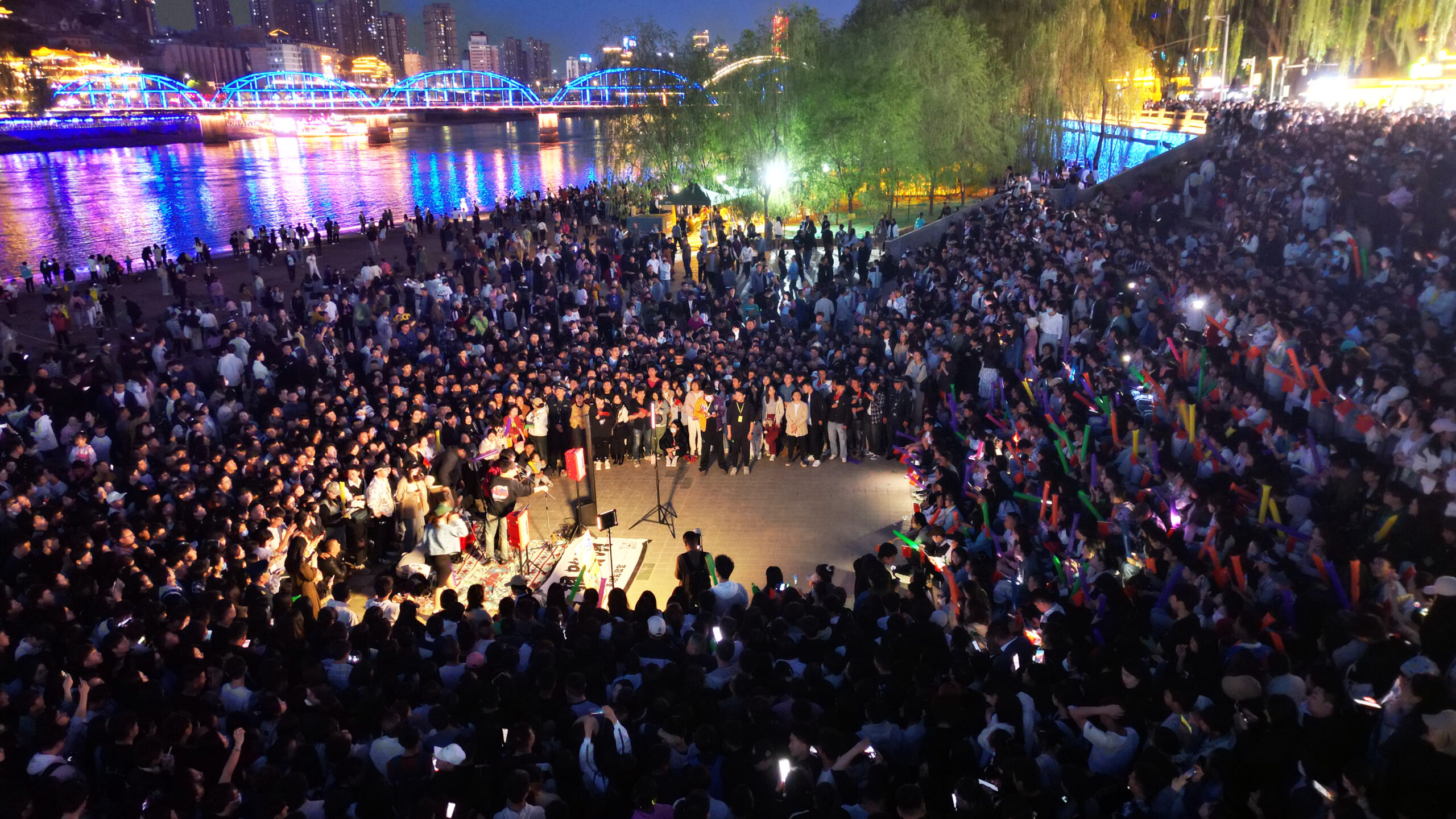 临近“五一”假期,中国“演出+旅游”持续升温,各类演艺花式撩拨年轻的心。有网友说,“不是敦煌鸣沙山去不起,而是兰州黄河大合唱更有性价比。在3亿年的溶洞看演出还是头一回。沙漠、星空、万人合唱,氛围感拉满。”连日来,由兰州本土乐队声场实验室路演带火的兰州黄河大合唱出圈。图为4月23日晚,甘肃兰州,在黄河畔举行的路边演唱会吸引民众前来“打卡”。