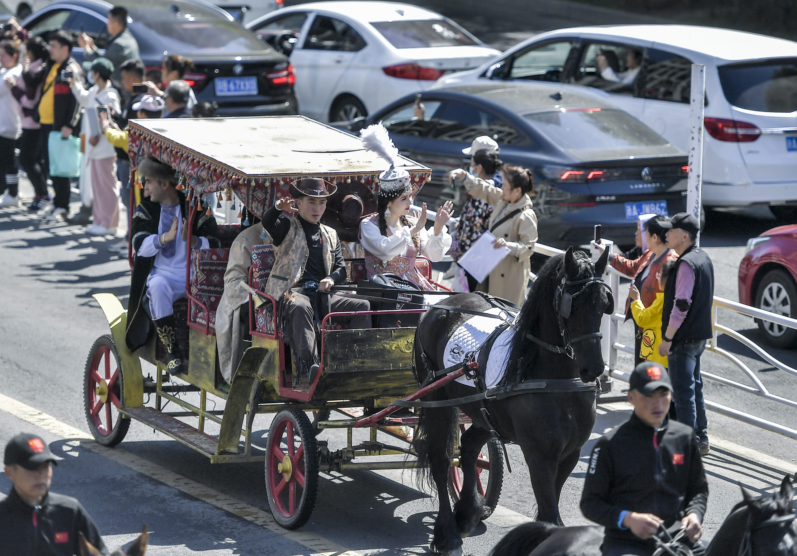 4月30日,新疆乌鲁木齐市,“遇见汗血宝马 梦回丝路驼铃”巡游活动在该市友好路等路段举行,由汗血宝马、马车及婚俗花车、驼队、机车组成的巡游方队亮相街头,吸引众多市民和游客围观。图为婚俗花车。