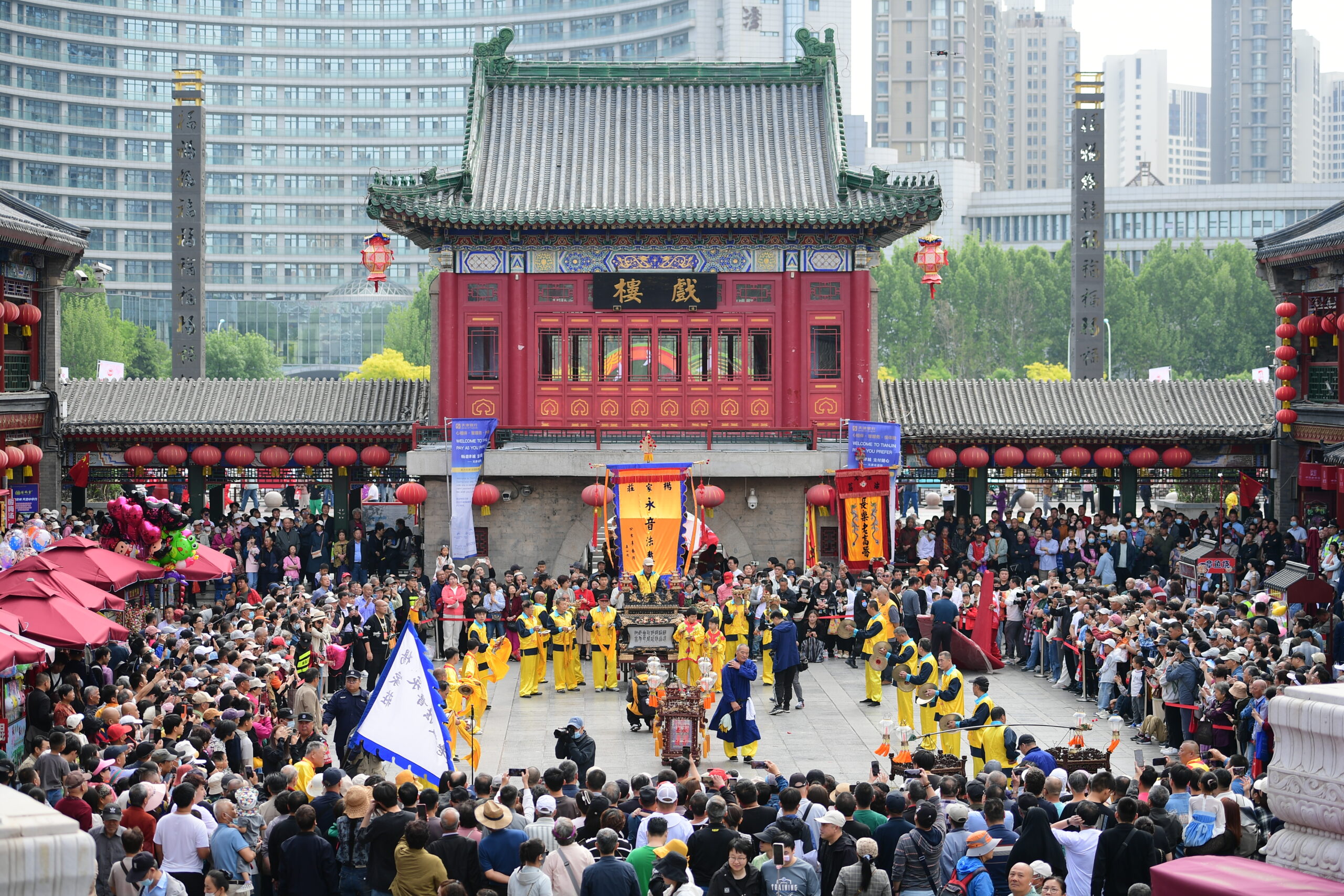 5月1日,“五一”假期首日,市民和游客在天津古文化街观看民俗展演。首届天津古文化街民俗文化旅游节系列活动上的民俗表演,吸引了许多市民和游客沉浸式感受津味民俗文化。
