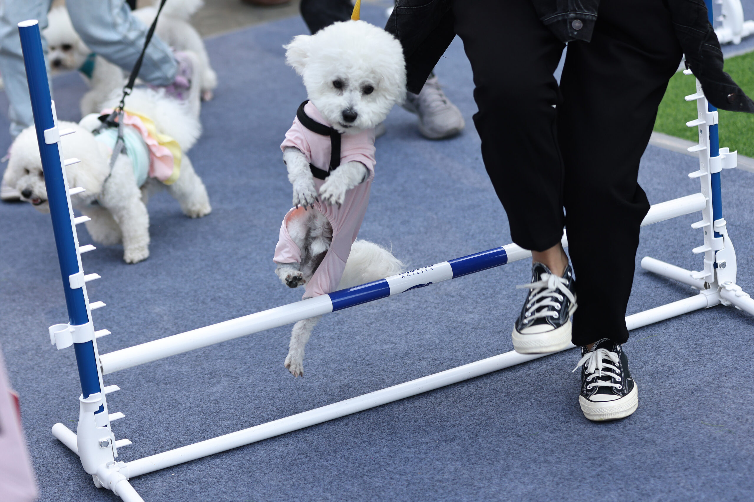 5月1日,江苏南京,一场萌宠趣味赛在街头举办,狗狗们赛跑、跨栏、绕柱……花样百出,妙趣横生。