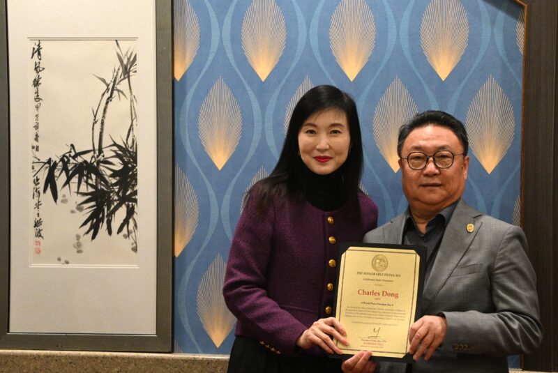 蒙特利公园市议员饶影凡向中国日报记者王栋梁颁表扬状
