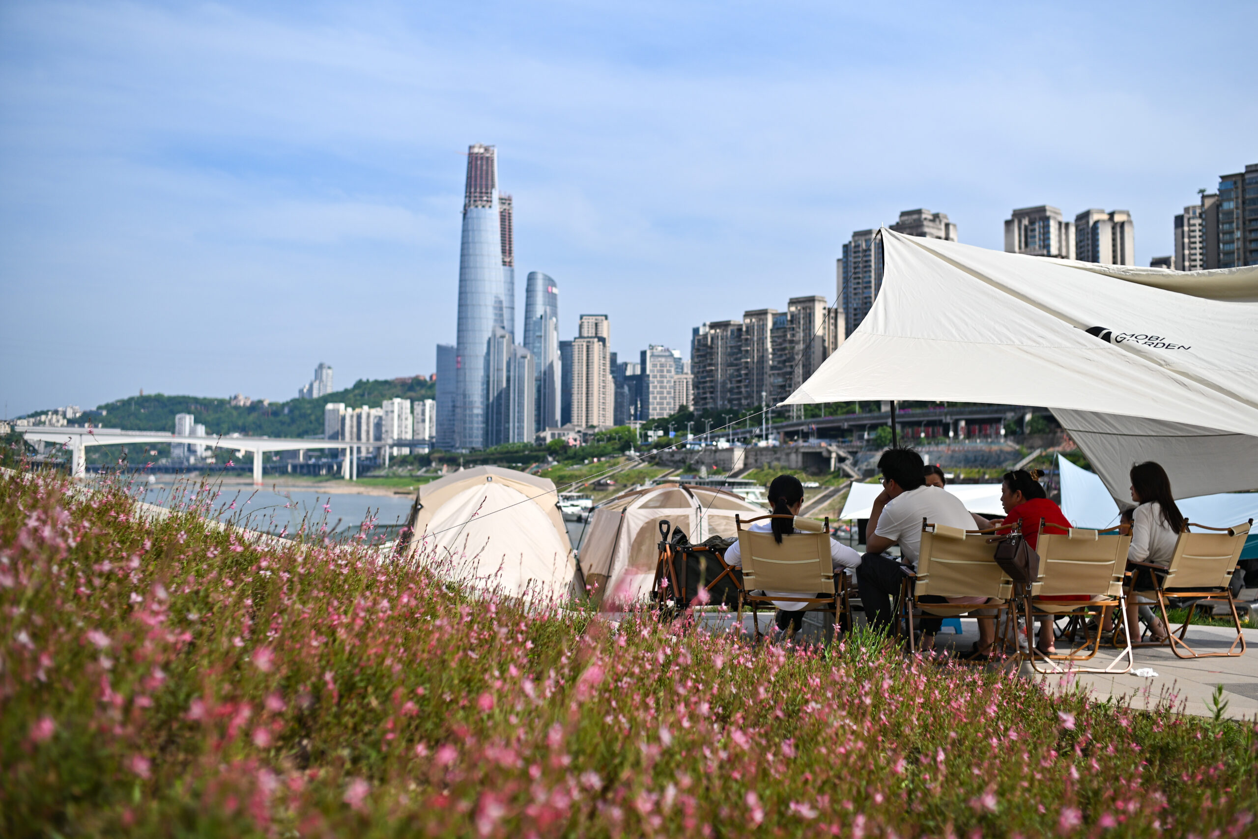 5月5日,重庆迎来晴好天气,不少市民来到江北区忠恕沱码头搭起帐篷、天幕露营,与家人、朋友一起享受“五一”假期。