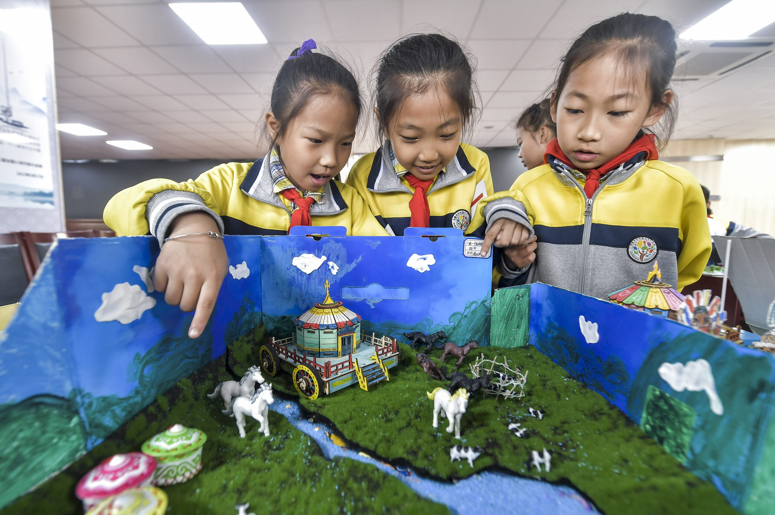 5月7日,新疆乌鲁木齐市,该市71小学的学生参观作品。当日,乌鲁木齐市沙依巴克区青少年科技创新大赛举行。
