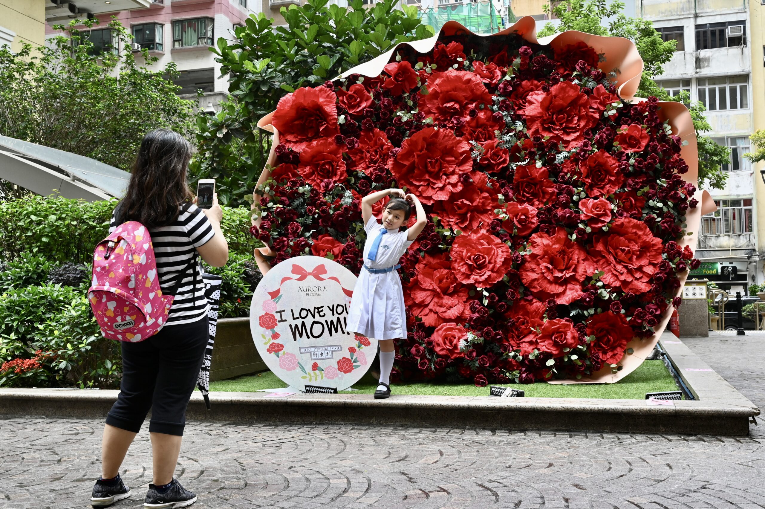 母亲节即将到来。5月8日,香港湾仔利东街打造以1000朵仿真玫瑰、高度超过3.5米高的巨型“玫瑰花束”,向母亲表达爱。图为儿童摆出爱心的手势拍照。 未经允许不得转载:城市新闻网icitynews » 香港巨型“玫瑰花束”向母亲表达爱