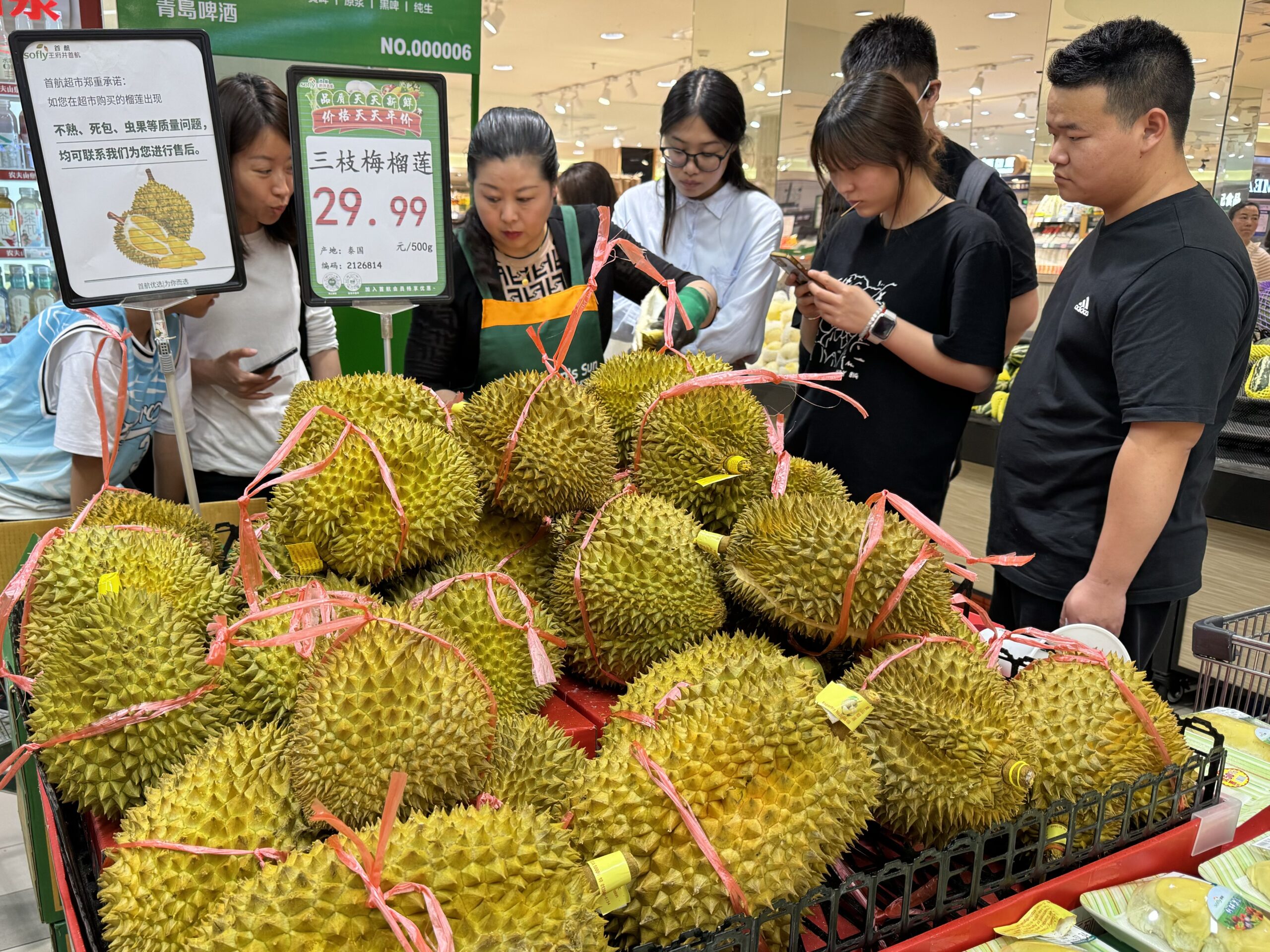 5月9日,市民在北京丰台区一家超市内选购泰国榴莲。目前,北京市场的榴莲售价在每斤20至40元之间,相比一个月前的60元降低不少,吸引消费者购买。 未经允许不得转载:城市新闻网icitynews » 北京榴莲价格走低 吸引消费者选购