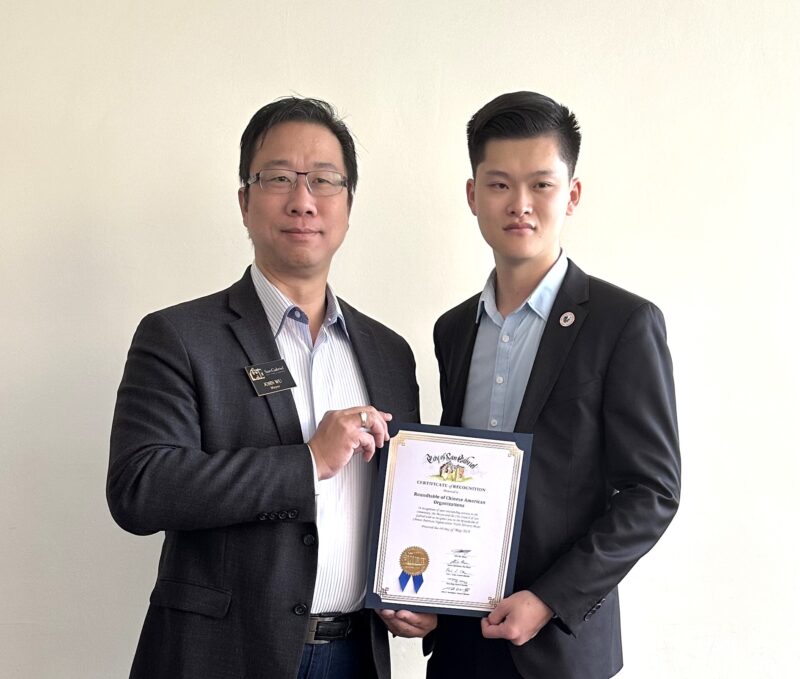 圣盖博市市长吴程远(左)向美华联青委会会长张奔颁发贺状