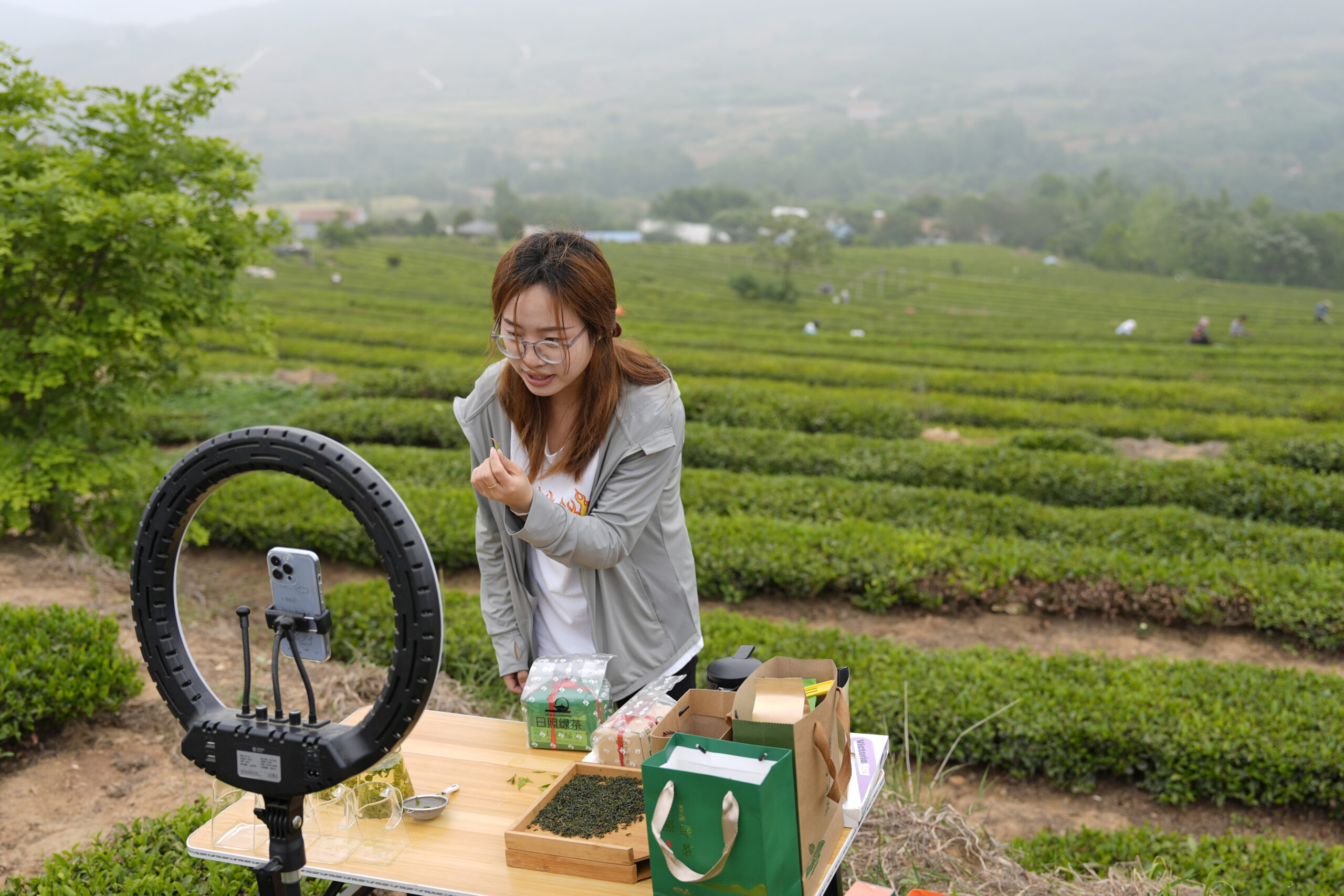 5月22日,在山东省日照市后村镇竹园社区茶园,茶农在直播售卖绿茶。“南茶北引”70年来,日照市现已成为世界三大海岸绿茶城市之一。目前,日照市茶园面积30万亩,年产干毛茶2.1万吨,总产值40亿元人民币,带动日照市30余万人就业。
