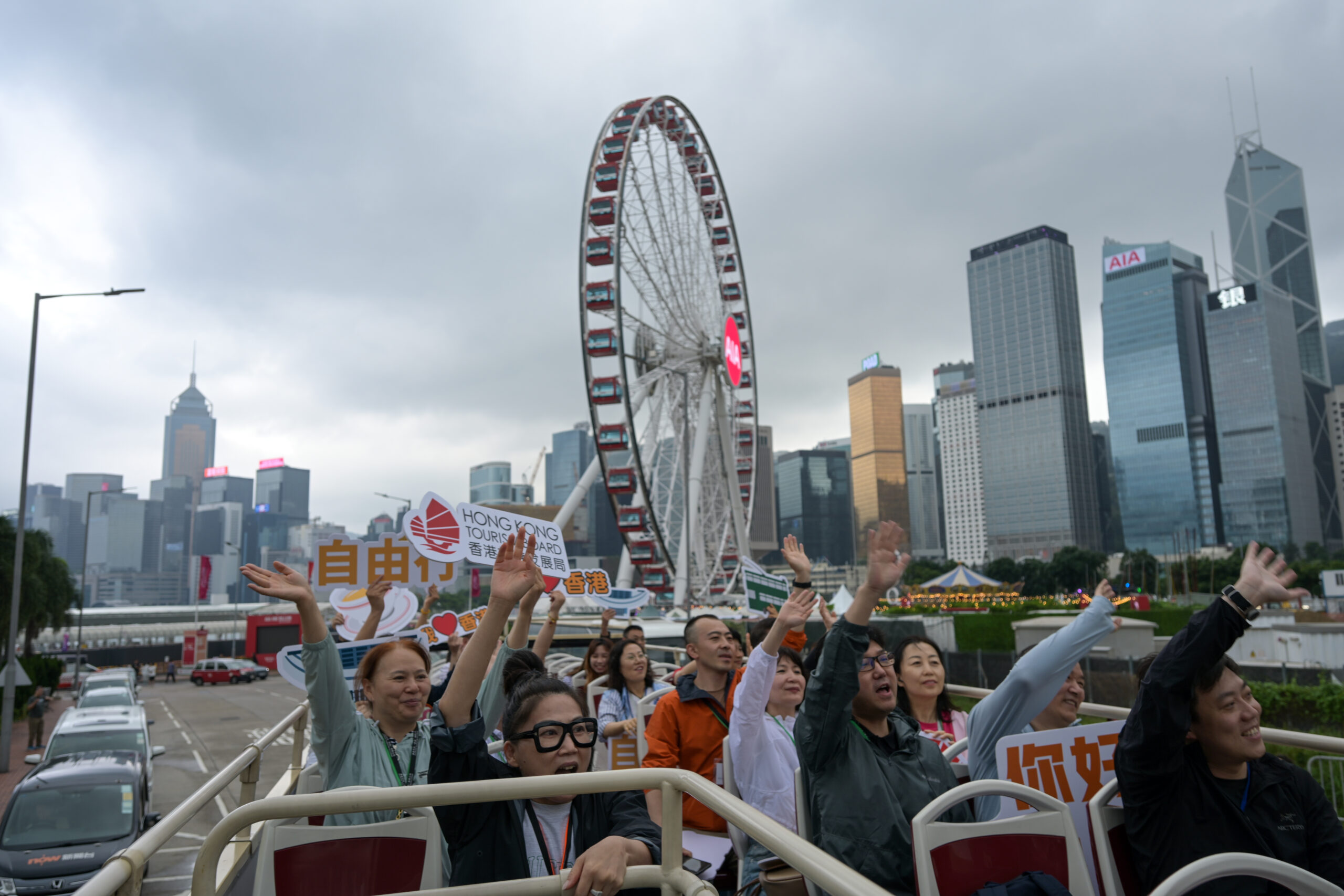 中国内地5月新增山西省太原市等8个城市为内地赴港澳“个人游”城市,香港旅游发展局日前邀请该8个城市的旅游业界代表来港考察,了解香港的特色文化旅游体验。图为6月4日,考察团乘坐香港敞篷巴士。
