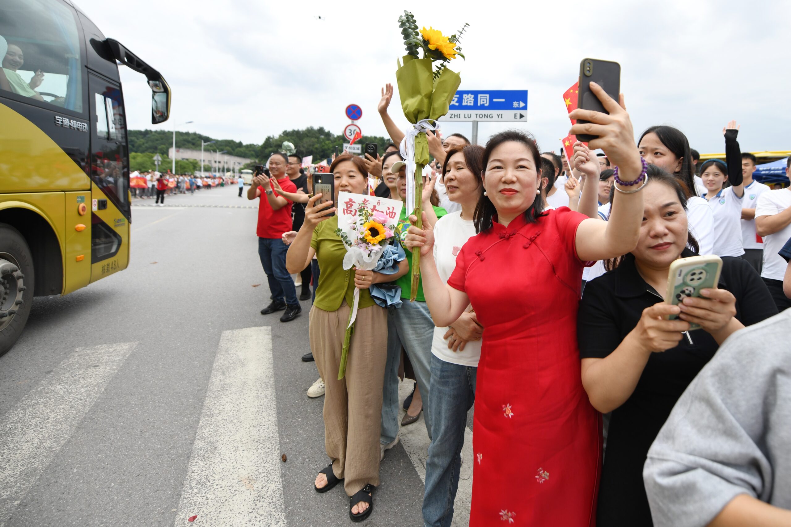 6月6日,2024年全国高考即将开考,长沙市同升湖高级中学的师生及部分家长在学校内外为高考学子加油,学生们乘坐大巴车前往查看考场。 未经允许不得转载:城市新闻网icitynews » 湖南长沙:高考学子提前查看考场