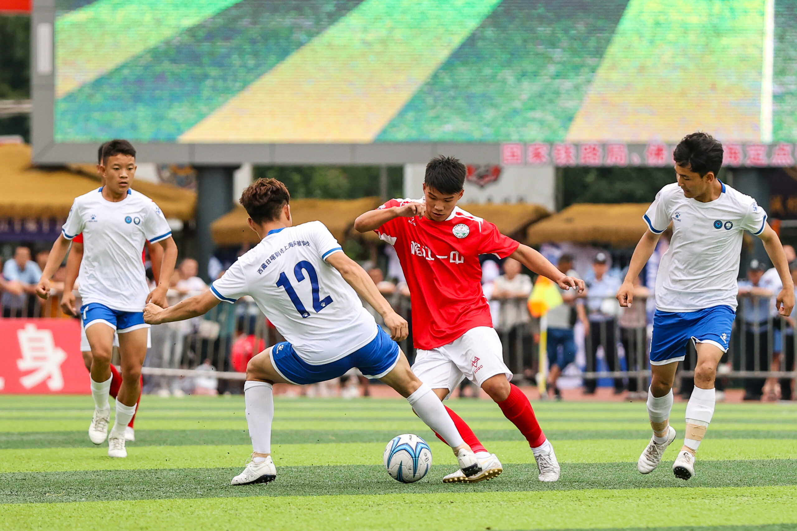 6月10日晚,2024年第一届全国“班级足球超级联赛”(“班超”)友谊赛揭幕战在贵州省黔东南苗族侗族自治州榕江县“村超”足球场上演。来自西藏自治区日喀则市上海实验学校的珠峰雪鹰队与榕江县青少年班超代表队进行了友谊赛。图为班超代表队队员(红衣)和珠峰雪鹰队队员在比赛中。