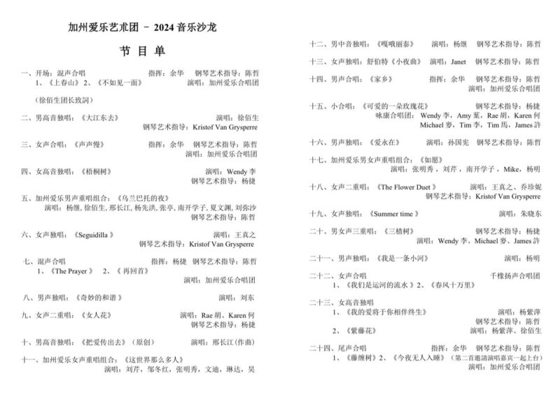 徐佰生团长特别介绍加州爱乐艺术团 – 2024 音乐沙龙旨在以歌会友,与扬声合唱团和咏康合唱团交流演出。通过音乐沙龙提高音乐家的演唱技巧与素质,让南加州音乐舞台更灿烂夺目,丰富民众文娱生活。加州爱乐艺术团是目前南加州最具规模,将近有60多个演唱者组成的具有较大影响力的合唱团之一。加州爱乐艺术团经常活跃在华人社区音乐舞台,还多次参加美国主流社区的演出,受到欢迎与肯定。