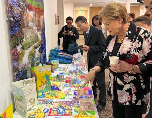 当地时间9月25日,由云南省政府主办的“飞虎归来格外亲”图文展暨“飞虎·驼峰文化”主题交流座谈会在加利福尼亚州州立理工大学波莫纳分校举行。140张由云南省昆明、腾冲、祥云、怒江等地中小学生创作的手绘贺卡,满载着对飞虎队的深情厚谊与中美友好的祝福,带来一份特别的感动和惊喜。图为飞虎队指挥官陈纳德将军的外孙女嘉兰惠等嘉宾观看手绘贺卡。
