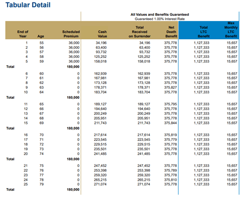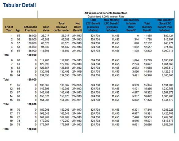 到65岁时, 长期护理保障累积到119万, 一个月可以cover $15,394。
