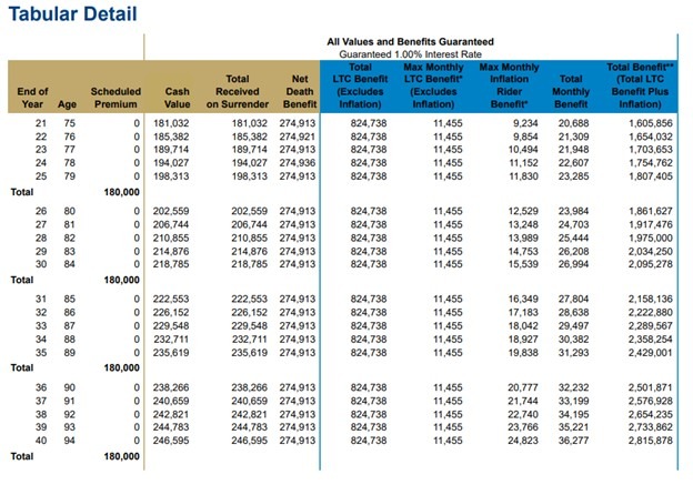 到80岁时, 长期护理保障累积到186万, 一个月可以cover $23,964。
