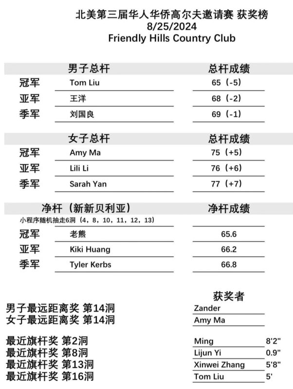颁奖本次赛事奖项:男子总杆冠军:奖金:$300(颁奖嘉宾蔡成华)5、女子总杆季军:奖金100(颁奖嘉宾马克思)女子总杆亚军:奖金$200(颁奖嘉宾李强)女子总杆冠军:奖金$300(颁奖嘉宾张可)6、净杆季军:奖金$100(颁奖嘉宾Patrick Wu)净杆亚军:奖金$200(颁奖嘉宾:萧军)净杆冠军、奖金$300亚军(颁奖嘉宾:赵晨)7、幸运奖8、18、28、38、48、58、68、78、88、98、108、118、128。奖金$50、颁奖嘉宾,张娴、 周刚、虞芷棋、林大田,Jeff恩、郭兰、Vivian Wu 、杨钧(peter yang)、张可团队。