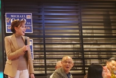 阿卡迪亚市前市长、市议员郑博仁(Paul Cheng)夫人顾瑷妮(Ainy Gu)致词支持