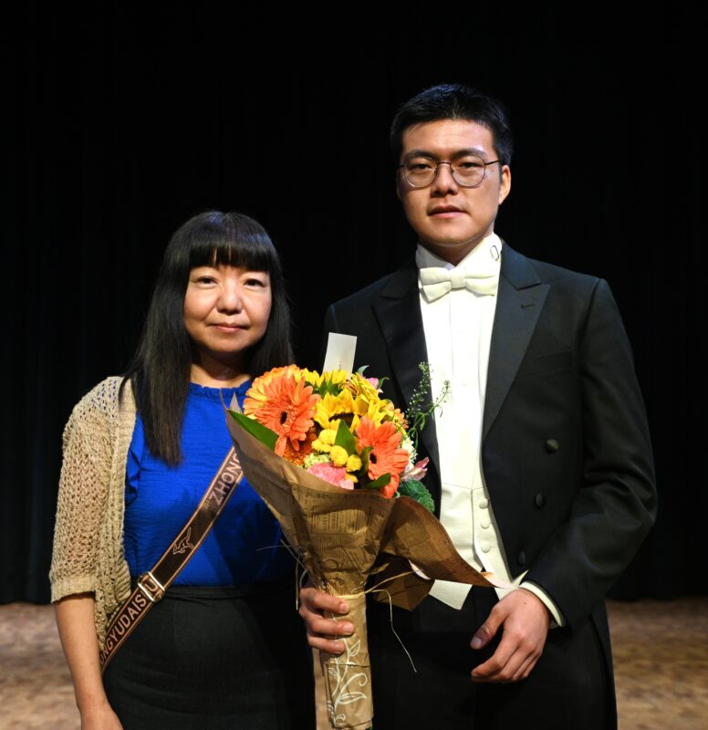 自闭钢琴王子段博文与母亲、Spectrum Dreams 创始人Sarah Cheng接受献花