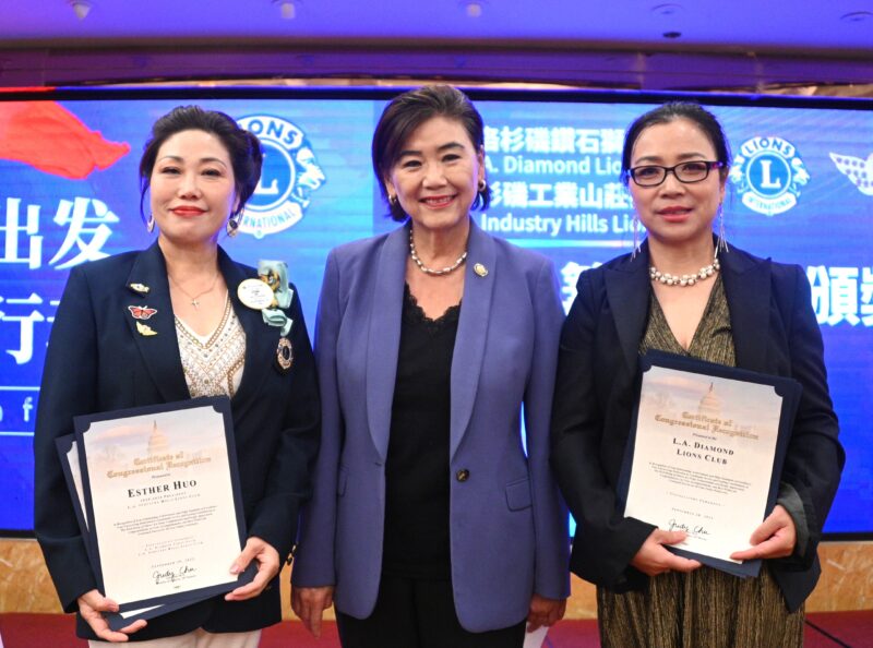 美国国会议员赵美心(Judy Chu)向钻石狮子会新会长海潮(Hidy Huo右)、工业山庄狮子会新会长胡娜(Esther Hu左)颁发贺状