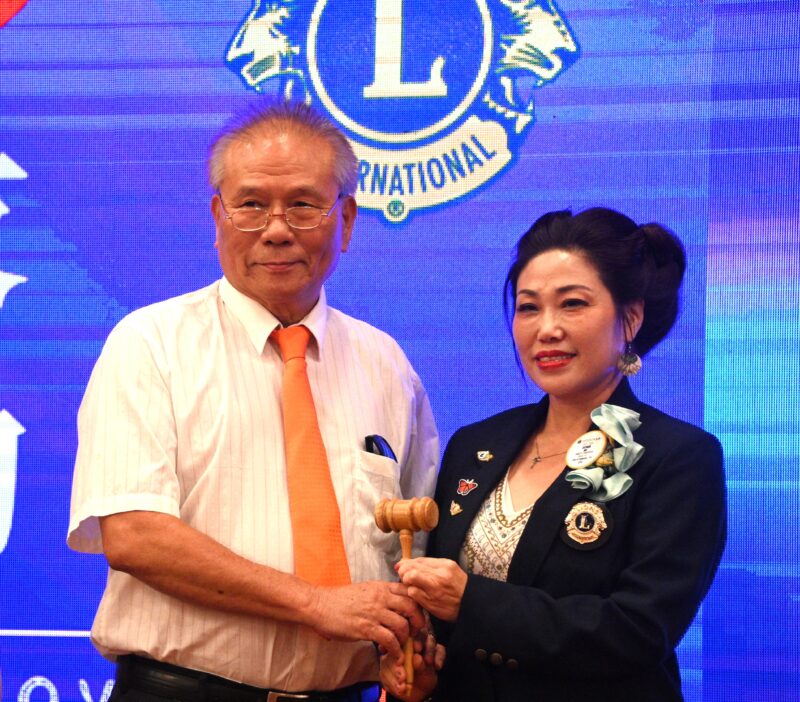 工业山庄前会长Mel Chang把法槌交給工业山庄狮子会新会长胡娜(Esther Hu右)