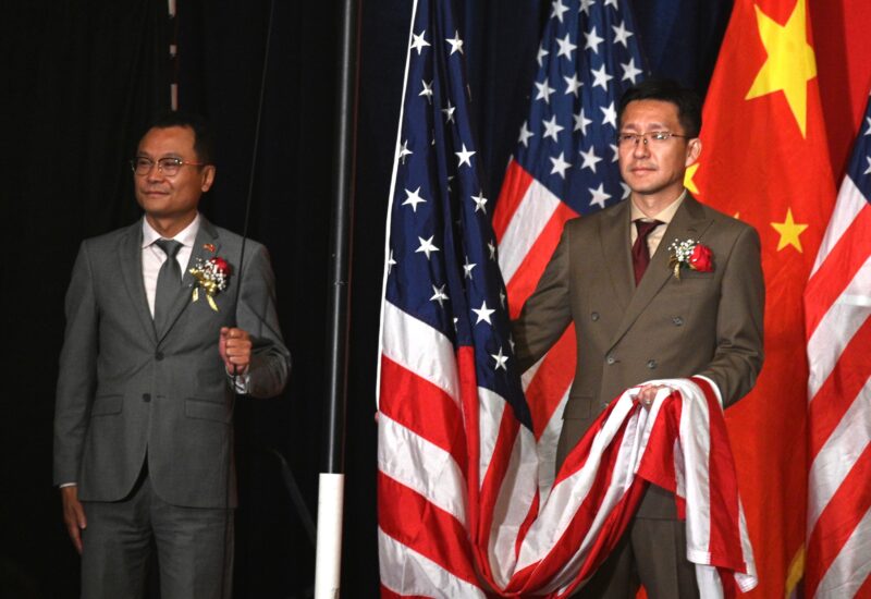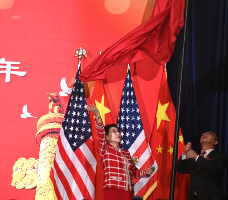 美国大连经贸文化联合会会长潘镭(右)、美国内蒙古总商会会长于忠霞(左)升起中国国旗