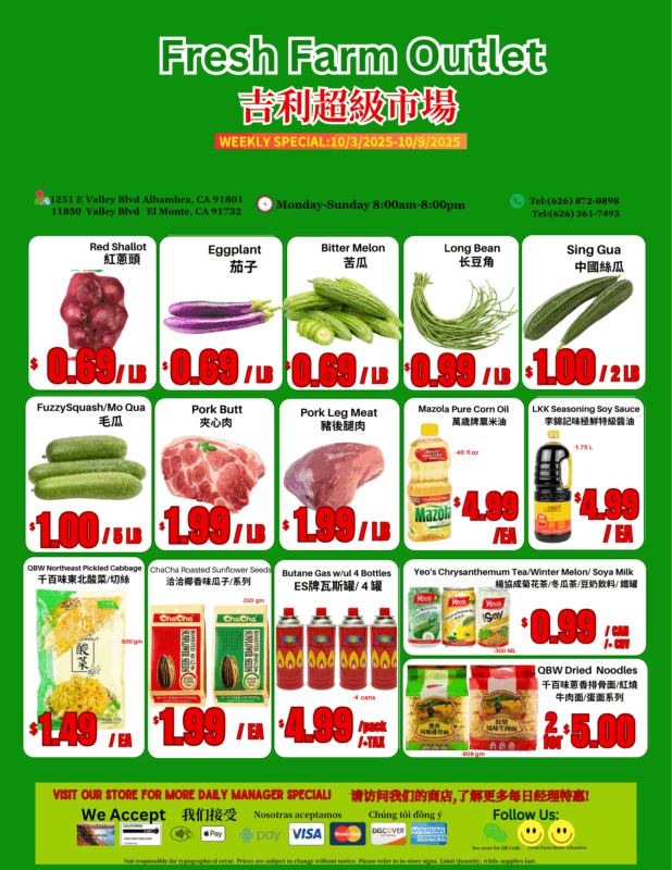 吉利超市连琐店每周都有特价,优惠活动仅限El Monte店,Alhambra店,务必把握机会,快快来选购。请以广告为准。中秋佳节有特价从10月3日至10月9日特价品最新广告: