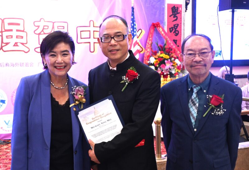 美国国会议员赵美心(Judy Chu)向美国南加州广府人联谊会會長、导演梅宁(中)、总召集人马树荣(右)颁发贺状