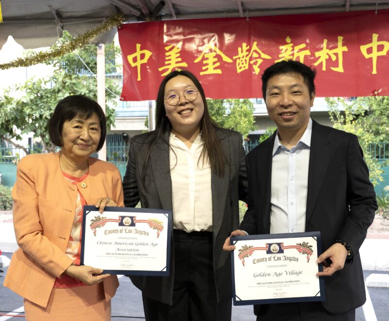洛杉矶县政委员代表向中美金龄会理事长齐铱(Iris Chi左)、理事李凌霄(Tim Li右)颁发贺状