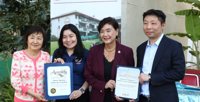 美国国会议员赵美心、加州众议员方树强助理向中美金龄会理事长齐铱(Iris Chi左1)、理事李凌霄(Tim Li右1)颁发贺状