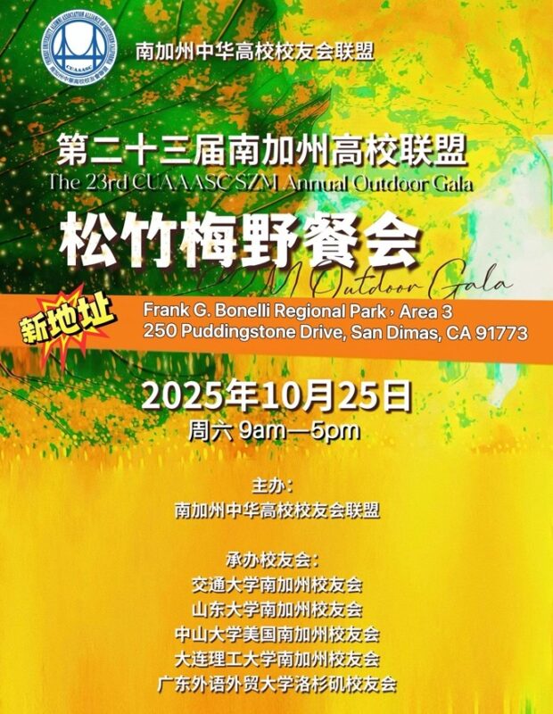 城市新闻10月17日圣地玛斯报导,由南加州中华高校校友会联盟(CUAAASC)主办的第23届松竹梅千人野餐会,将于10月25日(星期六)上午九时在Frank G. Bonelli Regional Park Area 3(250 Puddingstone Drive, San Dimas, CA 91773)隆重举行。本次活动将对公众开放,欢迎大家踊跃参与,共同见证这一年度盛事。