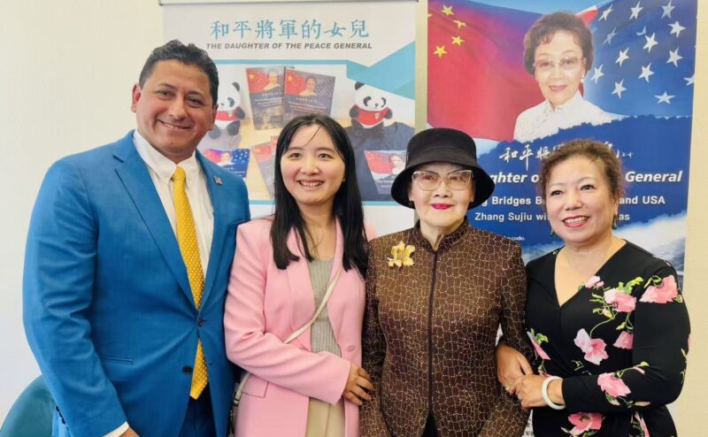 左起:美国加州南湾华协赫乔治(Jorge Herrera Avila)会长、秘书长谢婷、侨领张素久、美国飞虎队研究院执行院长梁玉霞