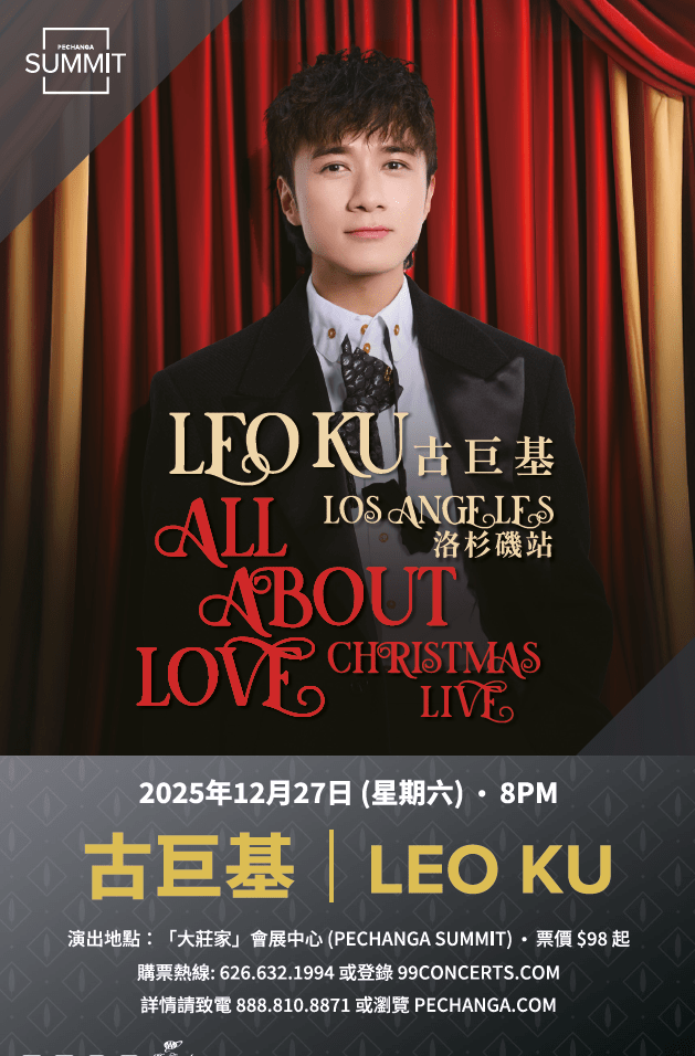 快來「大莊家」會展中心 (Pechanga Summit)欣賞《古巨基All About Love Christmas Live演唱會》,票價由$98起, 欲免向隅,訂票從速。購票熱線: (626) 632-1994, 查詢有關詳情可致電(888) 810-8871或上網至www.Pechanga.com.