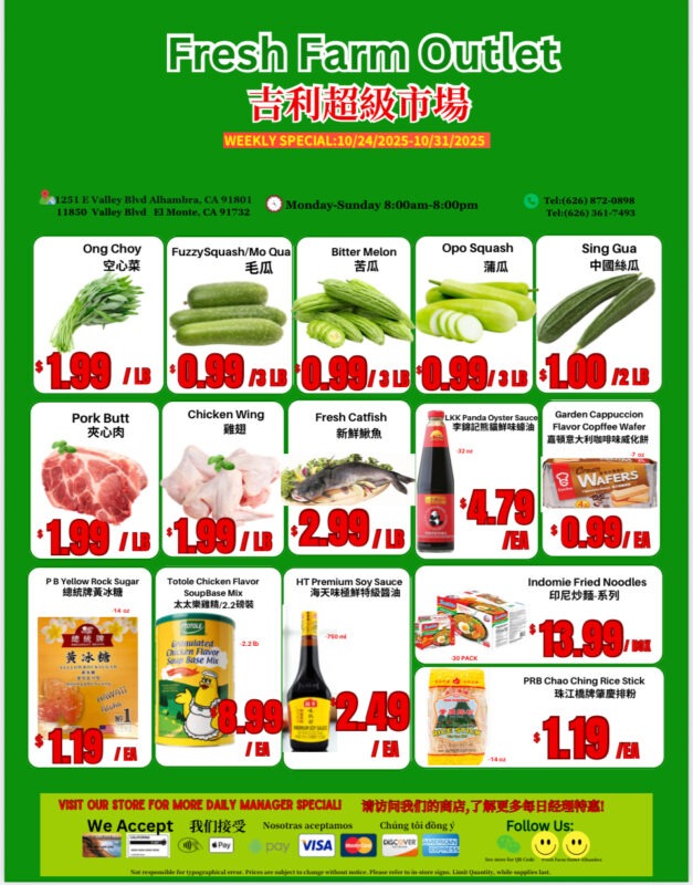 城市新闻10月24日艾尔蒙地市、阿罕伯拉市报导,吉利超市连琐店已有3家门店,为答谢广大顾客一直以来的支持与厚爱,吉利超市连琐店10月下旬有特价品,请多多光临选购。吉利超市连琐店每周都有特价,优惠活动仅限El Monte店,Alhambra店,务必把握机会,快快来选购。请以广告为准。从10月24日至10月31日特价品最新广告: